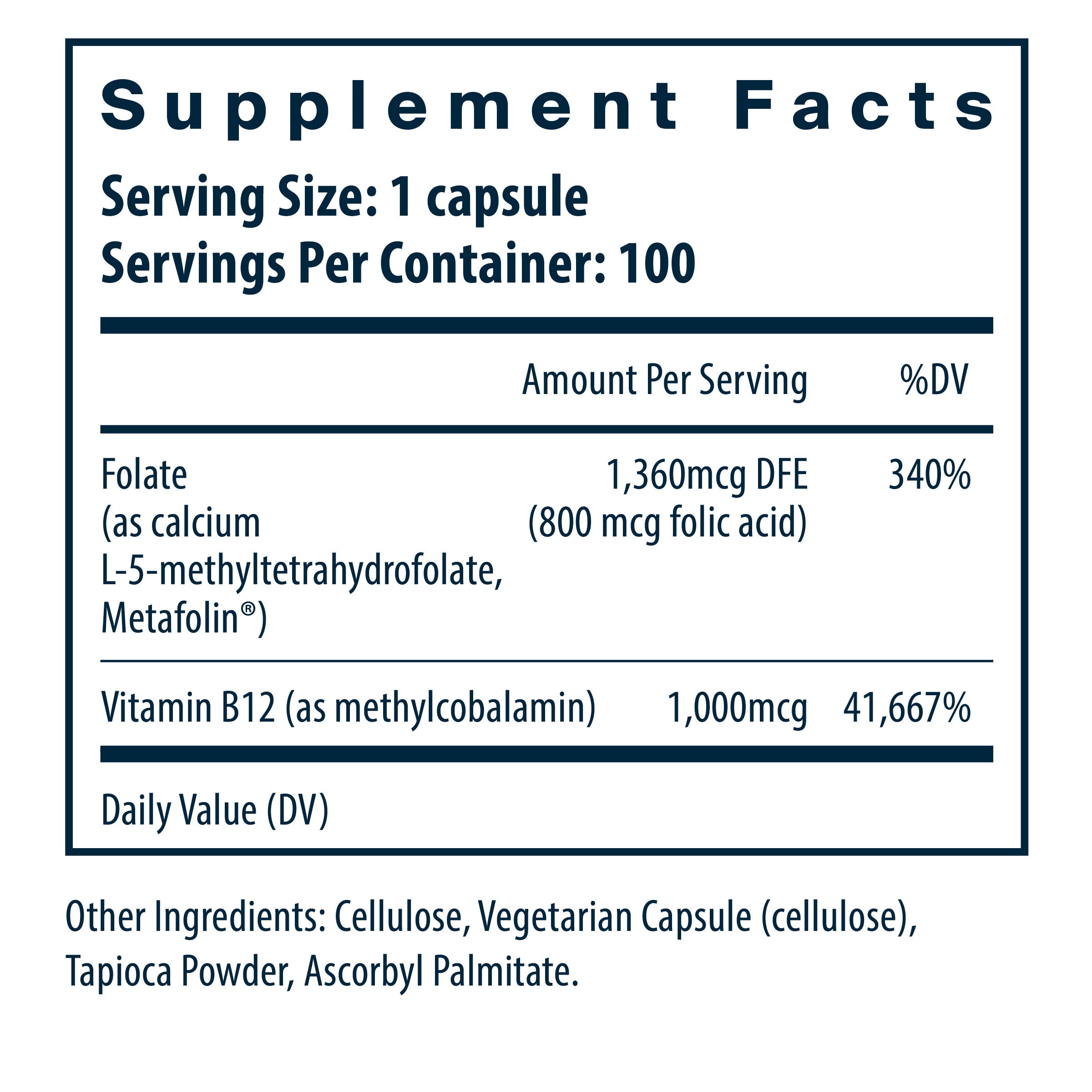 Vitamin B12 and Folate work together to help maintain the health of the gastrointestinal tract, nervous system and the metabolism of protein and fats.* Both maintain homocysteine levels that are already in the normal range and folate may reduce the risk of neural tube birth defects.* This formula contains the methylated forms of B12 (methylcobalamin) and folate (Metafolin L-5-MTHF), considered to be the most bioavailable and physiologically active forms.*