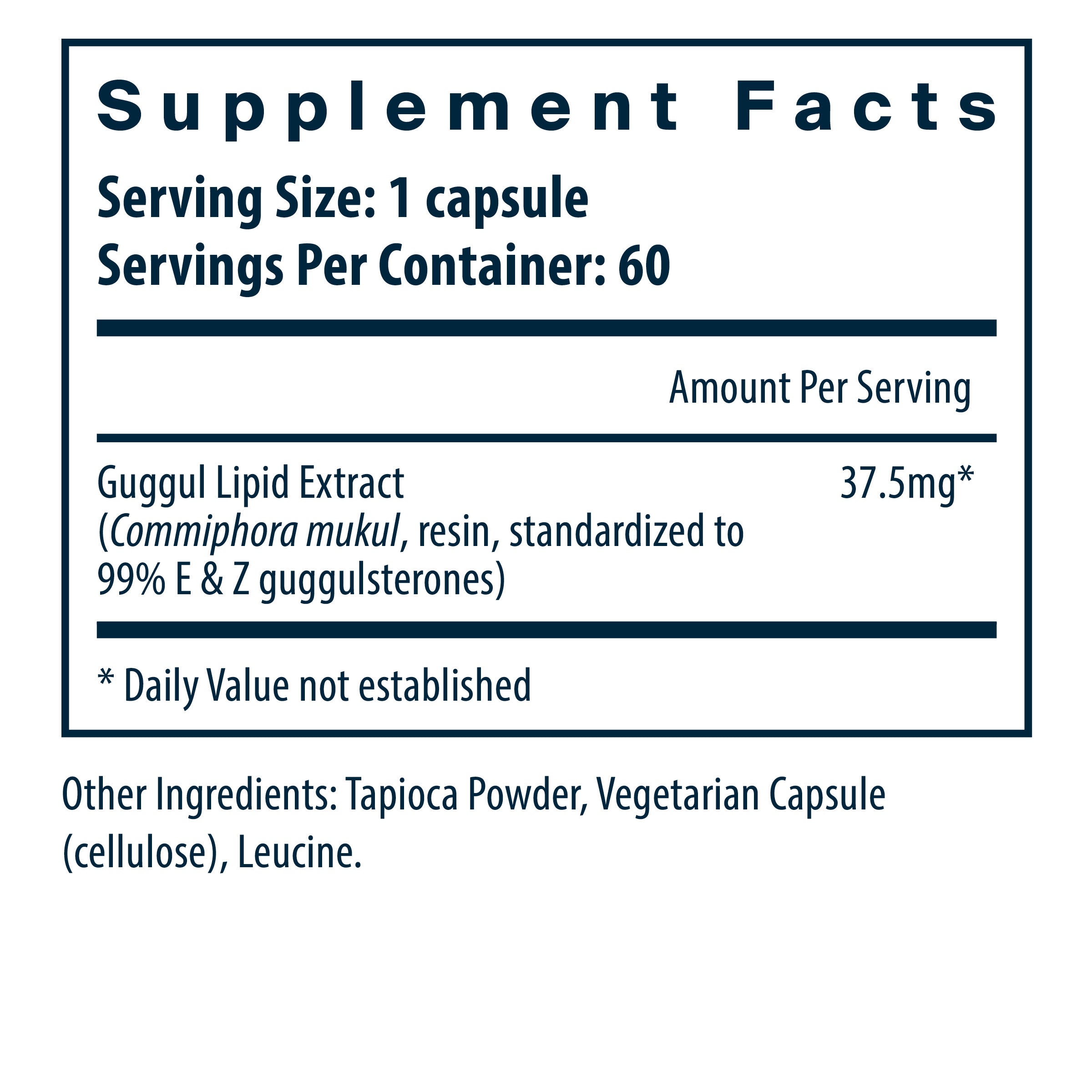 | Guggul Lipid Extract (Commiphora mukul, resin, standardized to 99% E&Z guggulsterones) | 37.5mg | * |