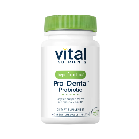 BLIS® probiotics for optimal oral health: Certain strains of Streptococcus salivarius, known as BLIS strains, have been clinically studied for crowding out the harmful bacteria that cause tooth decay and bad breath and releasing a specialized enzyme that targets those same bacteria and inhibits their growth.2 Pro-Dental Probiotic is the first dental probiotic to deliver-dairy free BLIS strains. This delicious mint chewable tablet helps replenish a balance of good bacteria in the oral microbiome.*