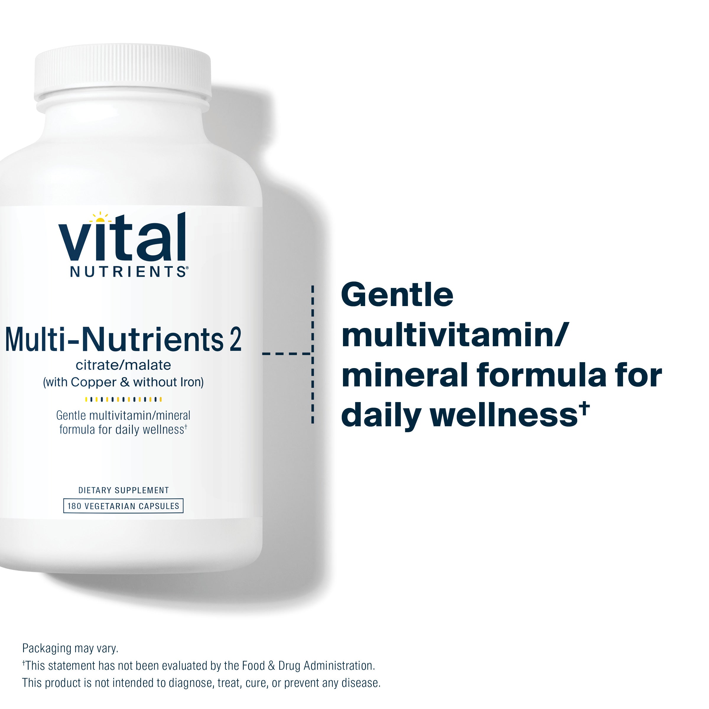 Multi-Nutrients 2 is a high potency multi-vitamin/mineral and trace element formula that provides the highest nutritional value for all systems of the body, including bone, skin, cardiovascular, liver, and immune support.* This formula incorporates premium ingredients to ensure optimal absorption and physiological activity, including folate as Metafolin® L-5-MTHF, Vitamin D3, potent antioxidants and mineral amino acid chelates.* It is a bioavailable, gentle formula that is well tolerated by most individuals.* Multi-Nutrients 2 contains minerals in citrate/malate form for better absorption.* This formula contains copper and does not contain iron.*