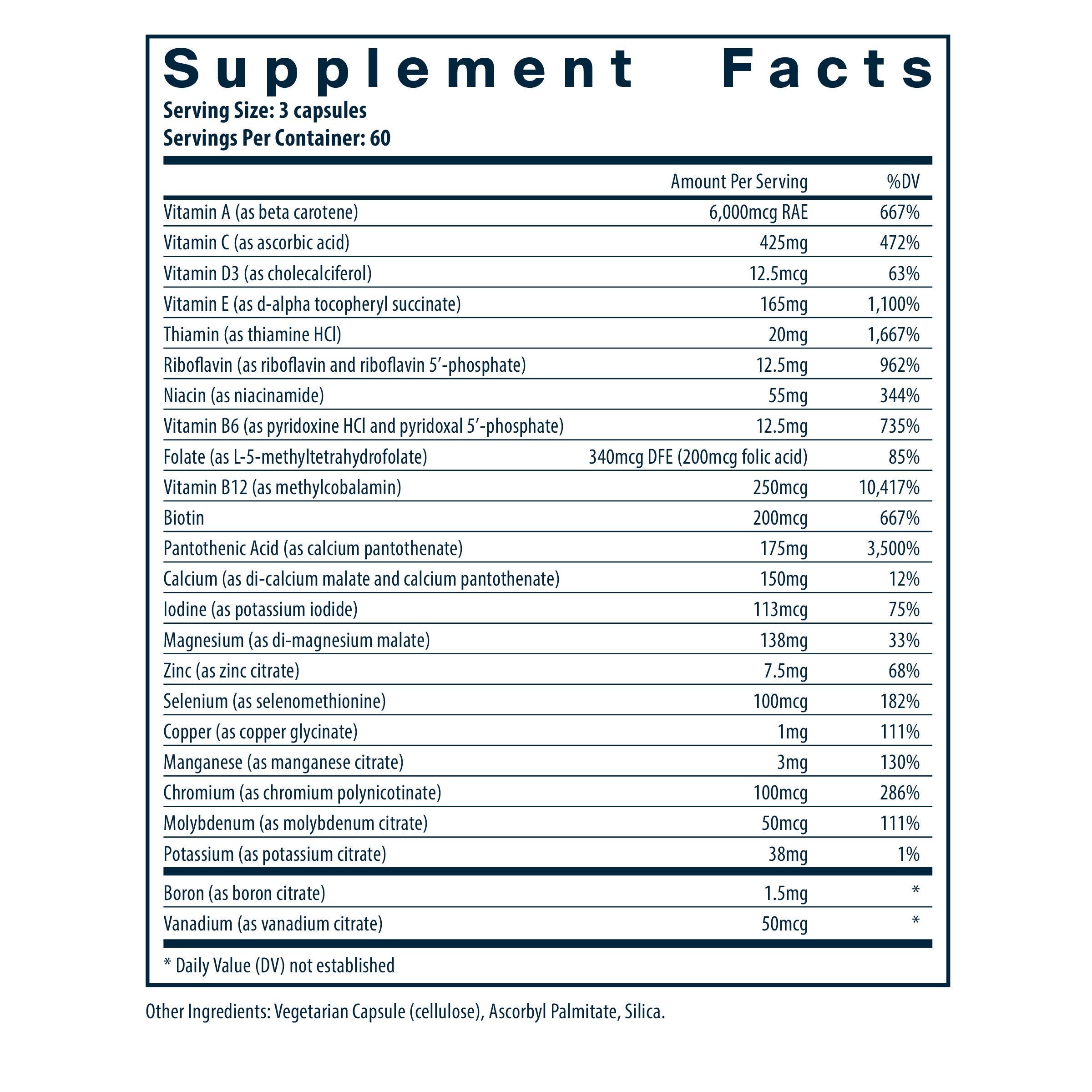 • High-potency multivitamin, mineral, and trace element formula provides essential vitamins and minerals for well-rounded nutritional support*