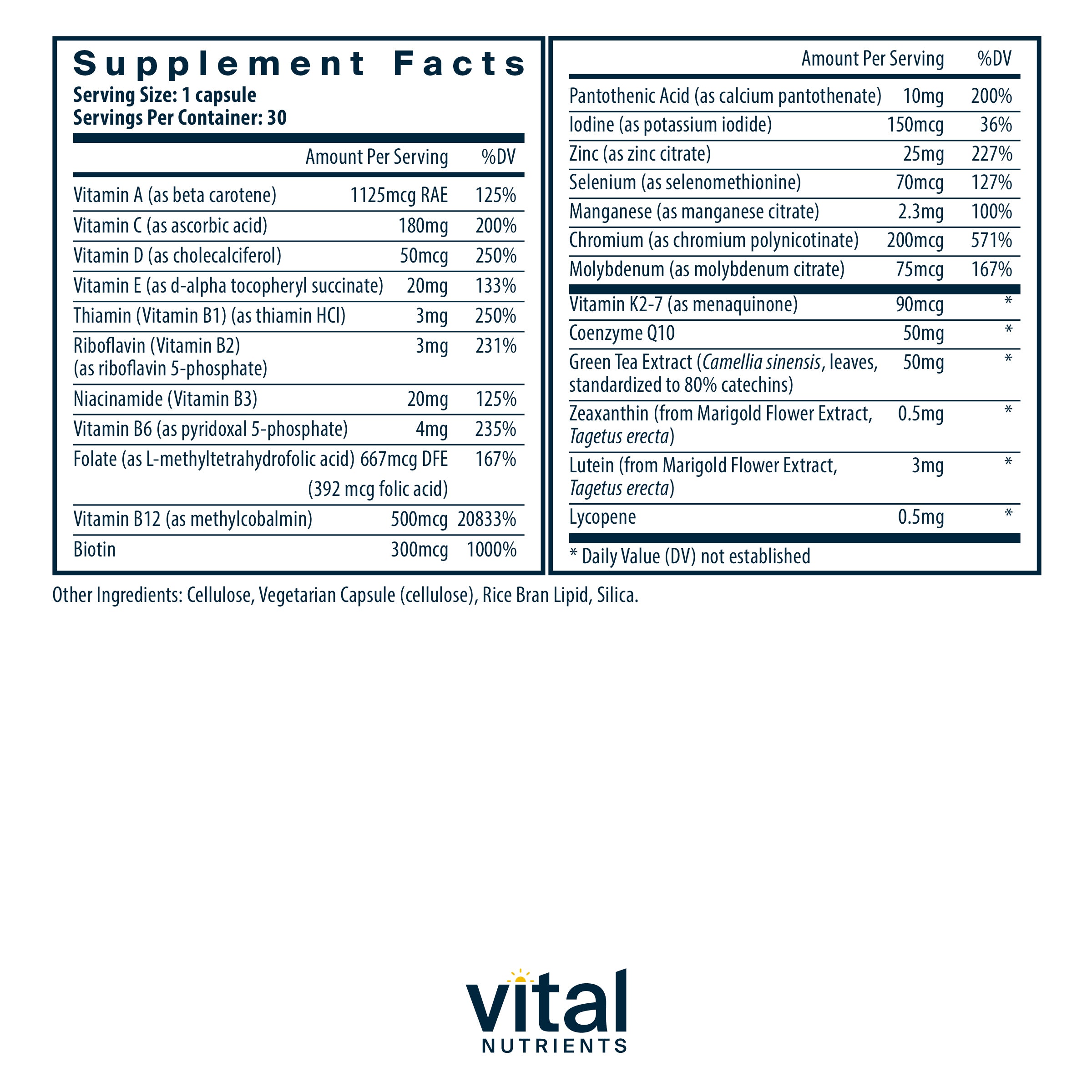 This single-capsule serving is designed for overall wellness and contains 19 vitamins and minerals as well as additional nutrients for cellular energy, eye health, and antioxidant support for heart health.2-5*
