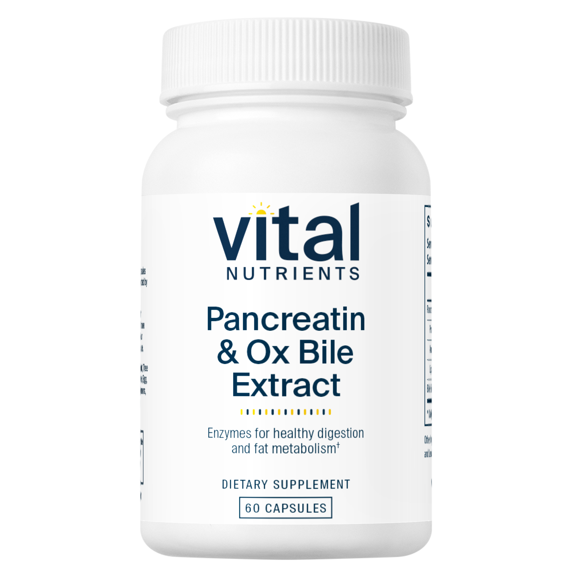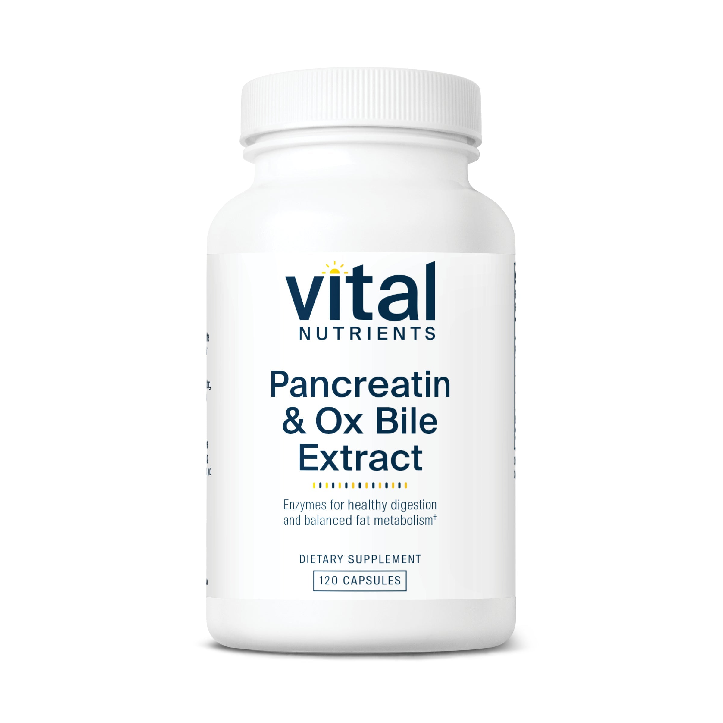 Pancreatin & Ox Bile is an excellent promoter of healthy digestion.* Pancreatin contains digestive enzymes including lipase, protease, and amylase.* These enzymes are normally produced by the pancreas and small intestine and help to maintain healthy breakdown of food such as fats, peptides, and starches in the small intestine.* When selecting pancreatic enzymes, it’s important to note that full strength pancreatin is the preferred form, to ensure it is free of lactose – a commonly used filler which can aggravate digestive complaints in the large proportion of the adult population who are lactose intolerant.* The addition of Ox Bile Extract may further support digestion and absorption of fats and fat-soluble vitamins in the small intestine. *