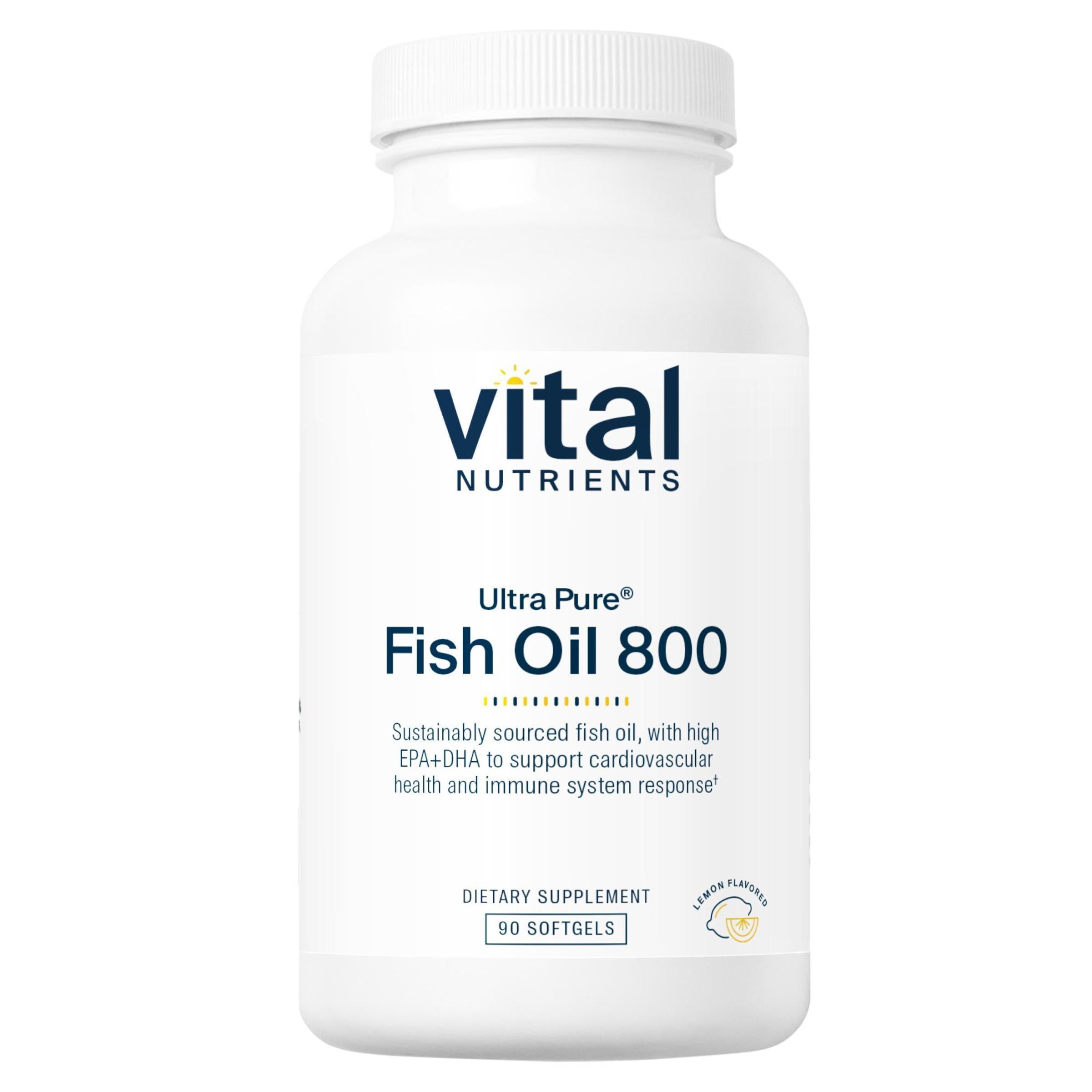 Ultra Pure® Fish Oil 800 is formulated to provide a higher concentration of EPA and DHA per softgel. Fish oil provides protection and maintenance of the normal function, fluidity and health of cell membranes*. The essential fats EPA and DHA help maintain and support soft tissue and connective tissue.* Fish oil helps promote cartilage and joint function and relieves mild mood changes and cramps associated with the menstrual cycle.* Fish oil helps maintain platelet aggregation levels that are already in the normal range.* Ultra Pure Fish Oil 800 softgels have a pleasant natural lemon flavor.*