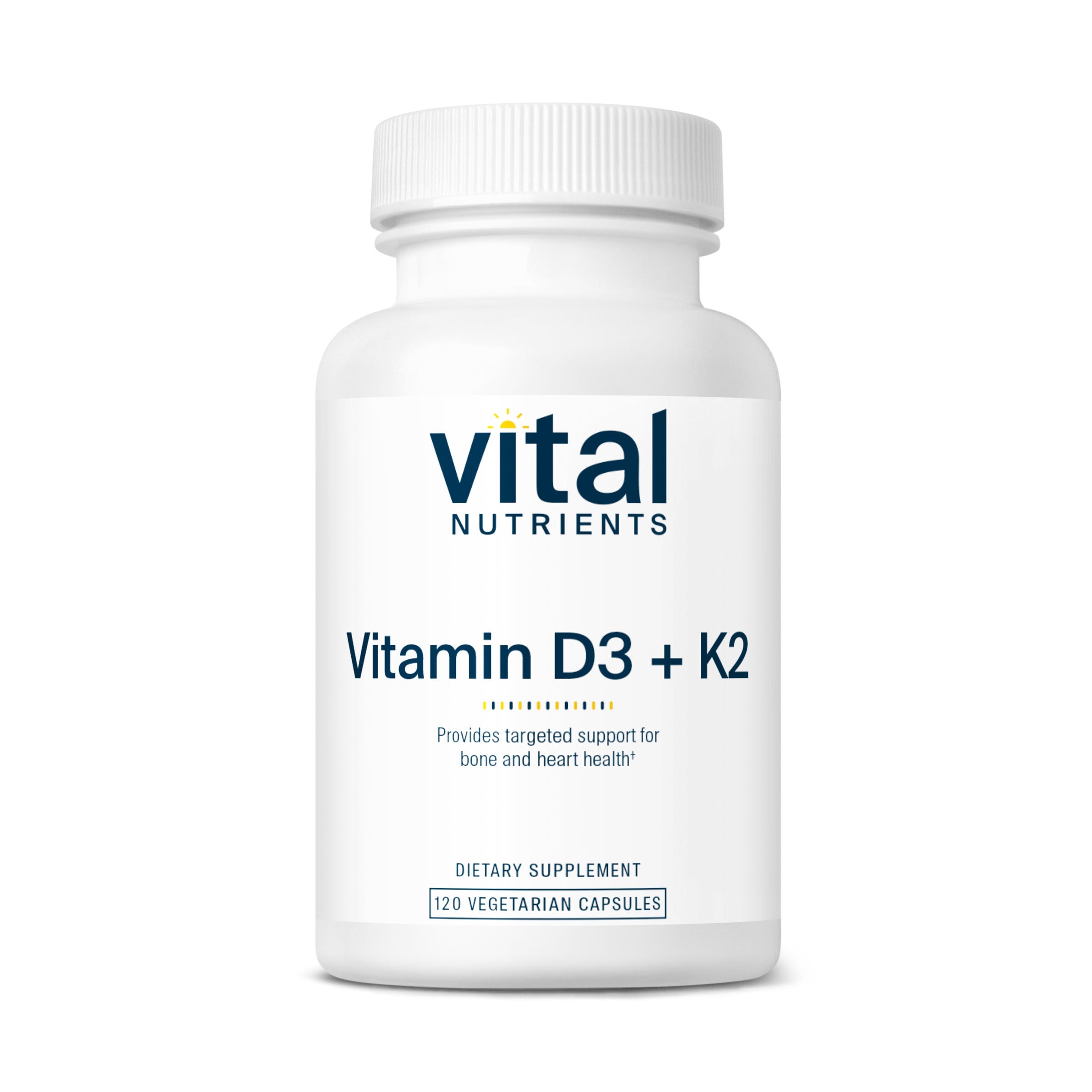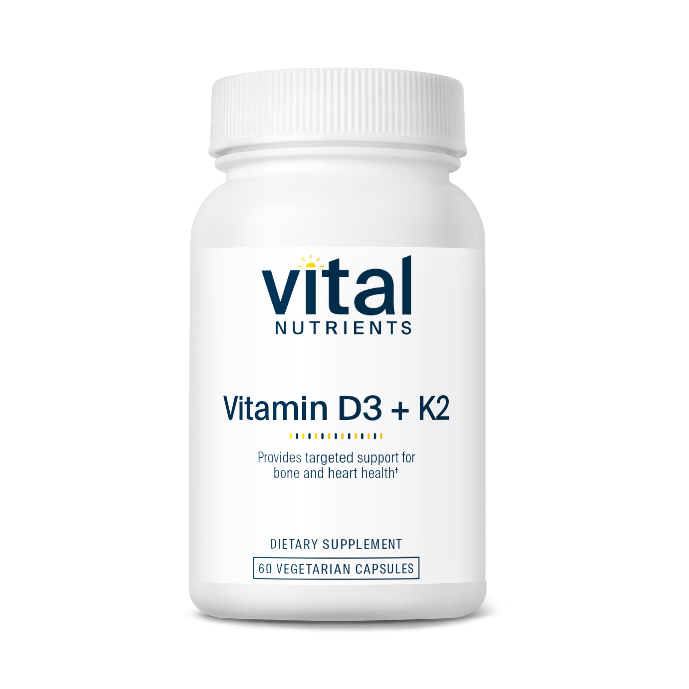Vitamin D3 (cholecalciferol) and Vitamin K2-7 (menaquinone) work synergistically to help maintain bone health.* Vitamin D3 helps maintain healthy serum calcium levels by promoting intestinal absorption and reducing urinary excretion of calcium. Vitamin K2-7 supports healthy bone mineralization by acting as a cofactor in the carboxylation of osteocalcin, allowing calcium to bind to this protein in the extracellular matrix of bone.* Vitamin K2-7 also supports healthy cardiac and vascular function.* This form of Vitamin K concentrates in the tissues of the arteries, where it aids in carboxylation of Matrix Gla Protein to help maintain normal calcium metabolism and support healthy vascular elasticity.* Additionally vitamin K2 may help support healthy lipid levels and glucose metabolism.* Although frank vitamin K deficiency is rare, research suggests the Western diet may not contain sufficient Vita-min K2-7 to optimize carboxylation of Gla outside the liver.* Higher dietary intakes of K2 have been associated with healthy levels of arterial calcification and elasticity.* Compared to other forms of Vitamin K, Vitamin K2-7 has a longer half-life, resulting in more stable levels in the body.* For best absorption of these fat soluble vitamins, take with a mixed meal or some healthy dietary fat.*