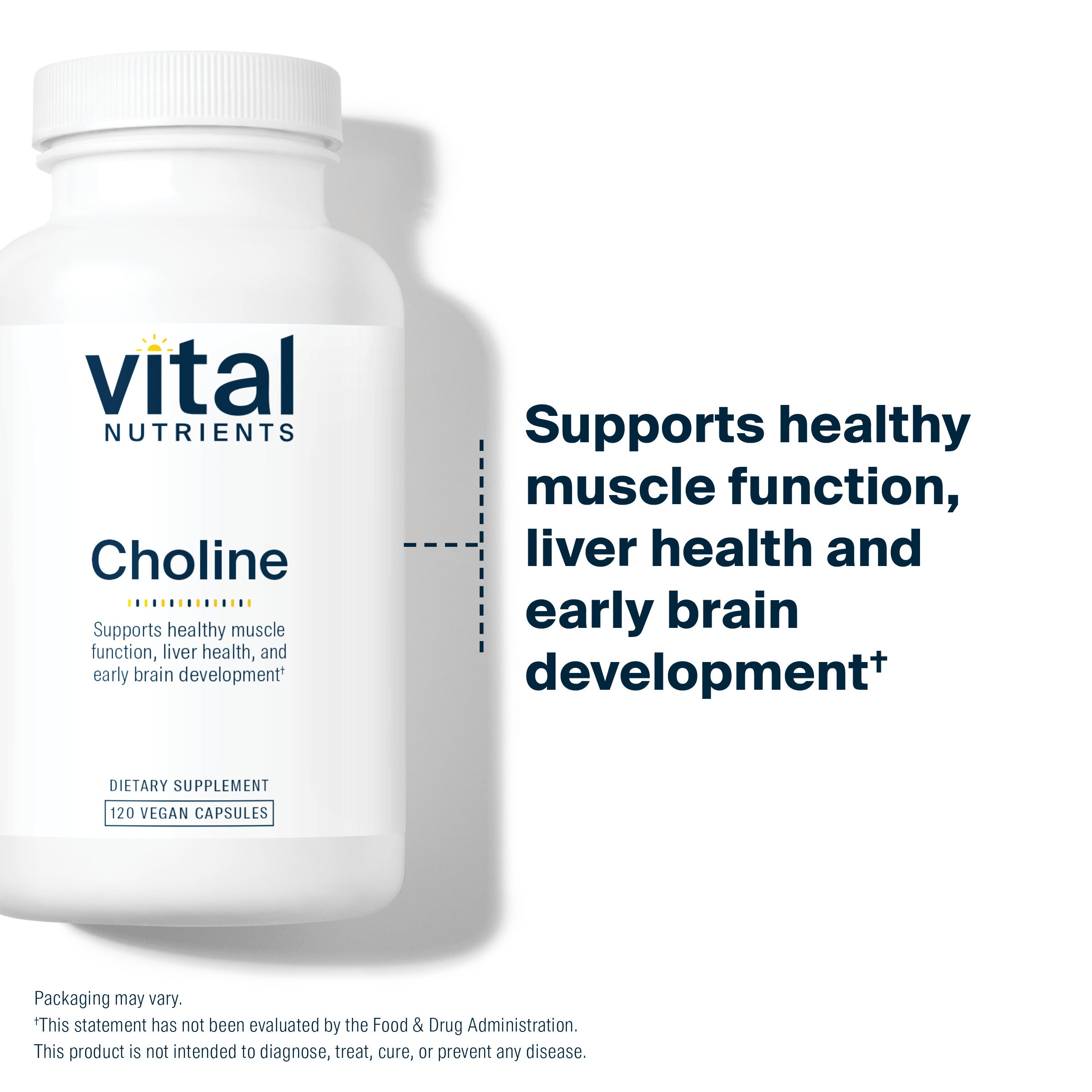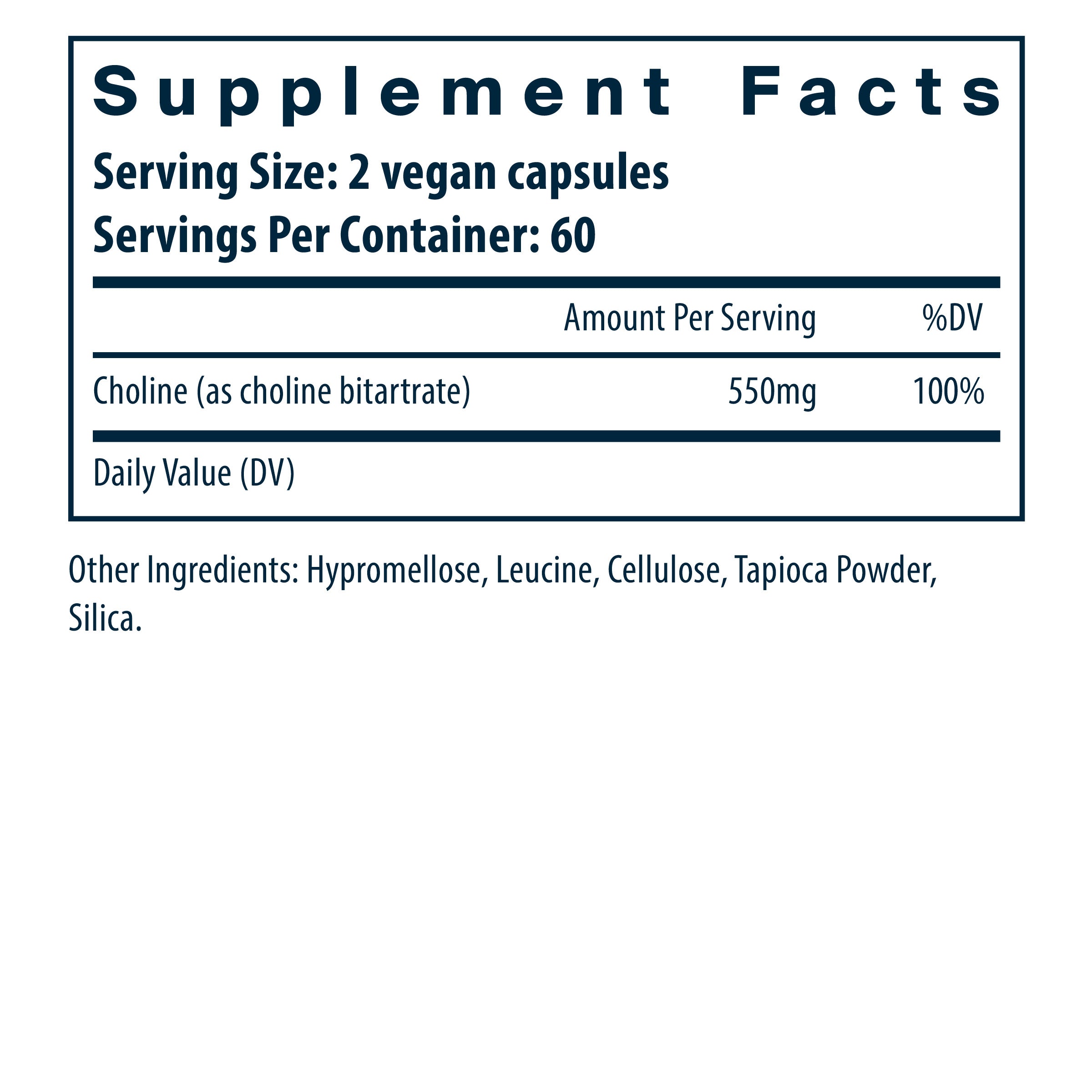 Choline is an essential nutrient naturally present in certain foods, especially animal products such as liver, salmon and eggs. Choline (bitartrate) provides methyl groups needed for many different metabolic functions, including normal muscle function, liver health and early brain development.* The body requires choline to make phospholipids, which are vital for cell membrane integrity and nerve myelination.* As a component of the neurotransmitter acetylcholine, Choline benefits memory, mood and muscle control.* Choline also helps modulate gene expression, cell membrane signaling, and lipid transport and metabolism.* Although humans produce some choline in the liver, the amount is not sufficient to meet the body’s requirements, and most people in the United States consume less choline than they need to prevent deficiency. This has led to the recent publication of a Recommended Daily Intake of 550mg for adults, which may be obtained from diet or a choline supplement. Groups at increased risk of choline deficiency include pregnant women, vegetarians and those with genetic variations involving the metabolism of choline, folate, and methionine.* The American Medical Association and American Academy of Pediatrics have both recently reaffirmed the importance of evidence-based amounts of choline for pregnancy and lactation. Preliminary research suggests that a higher maternal choline intake during pregnancy, and possibly lactation, may have lasting neurocognitive benefits for the offspring.*