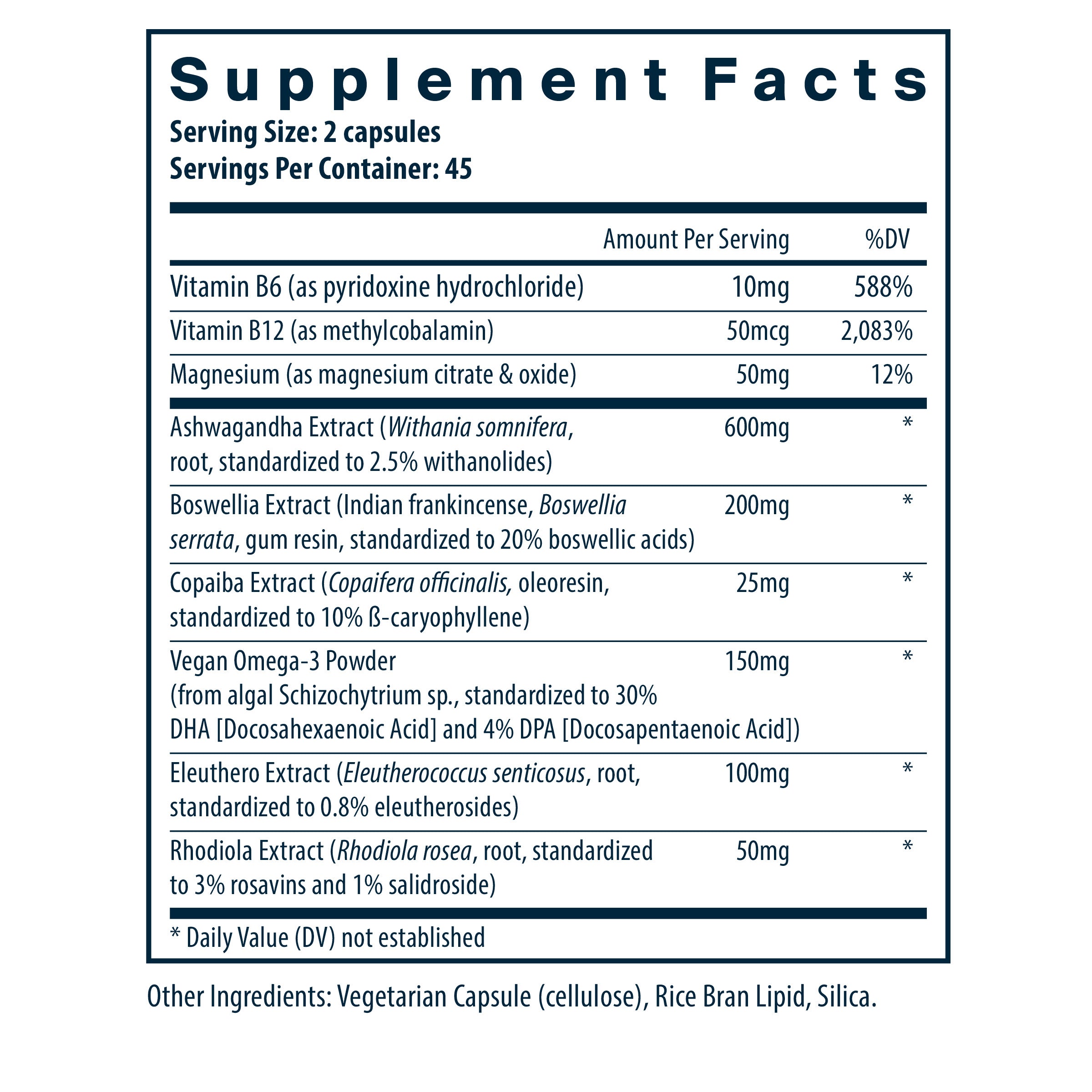 By effectively addressing these three elements, this formula encourages balanced cortisol levels to promote calm, focus, and clarity throughout the day, and restful sleep at night. This advanced formulation supports healthy energy production, while simultaneously promoting a calm state and balanced moods.*