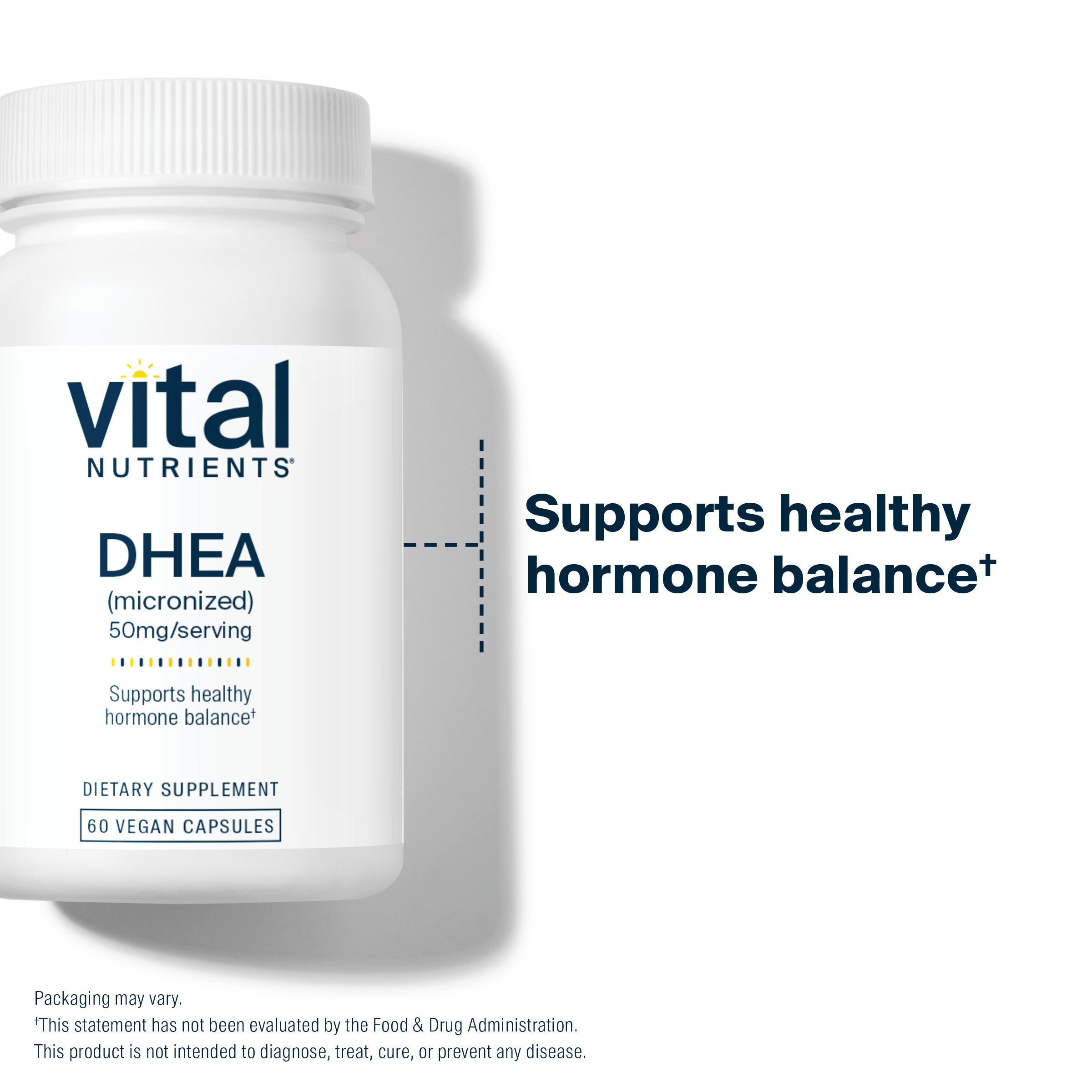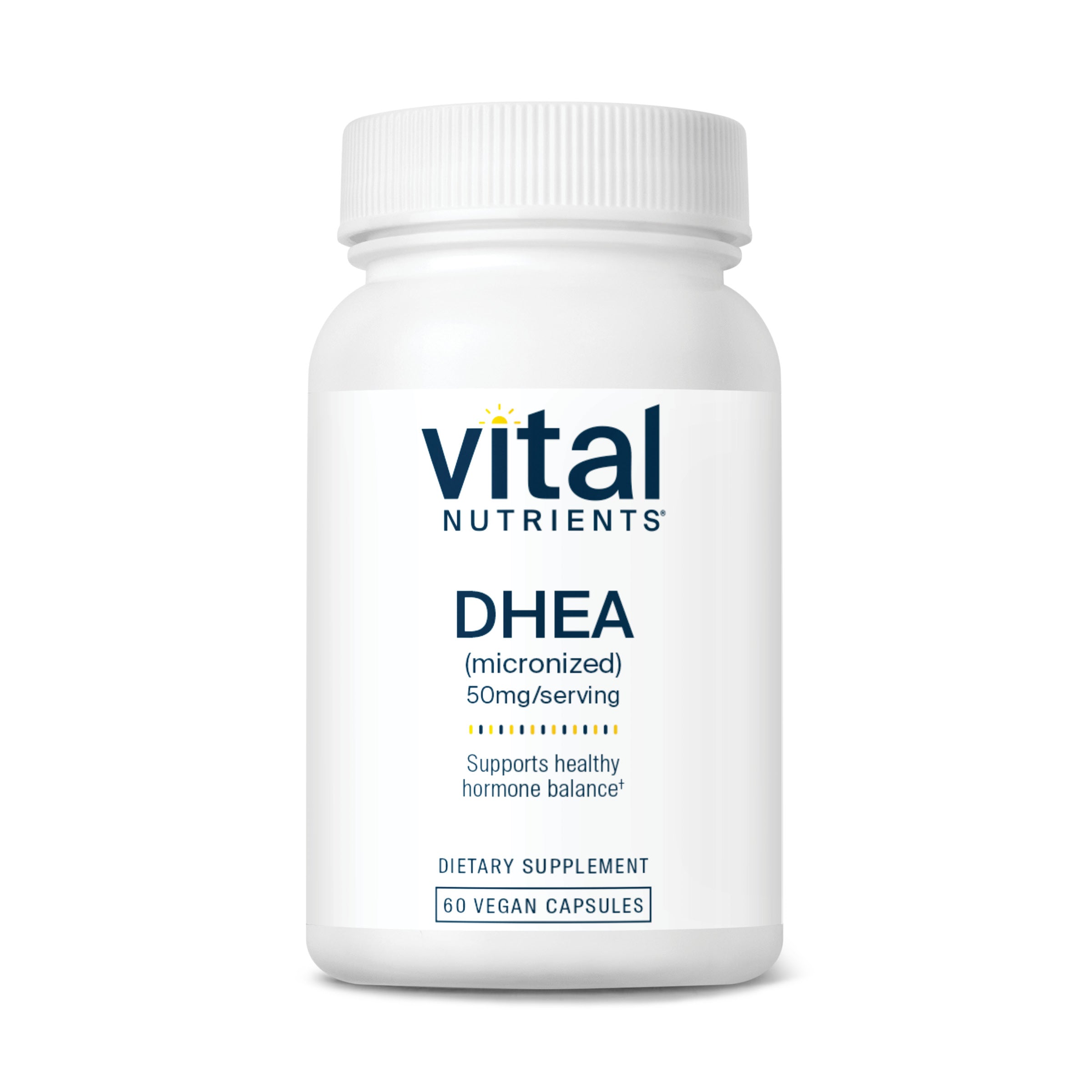 Levels of DHEA can decline with age as part of the natural aging process. DHEA is a hormone that is produced in our bodies by the adrenal glands and the levels of this hormone may begin to decline after the age of 30. Supplementing may help replenish what our bodies lose over time, to support healthy aging. DHEA is a precursor to androgens, and along with other adrenal hormones, supports fat, sugar and mineral metabolism, immune response, energy levels, and estrogen and testosterone levels.* Vital Nutrients DHEA is micronized to help increase absorption in the body.*