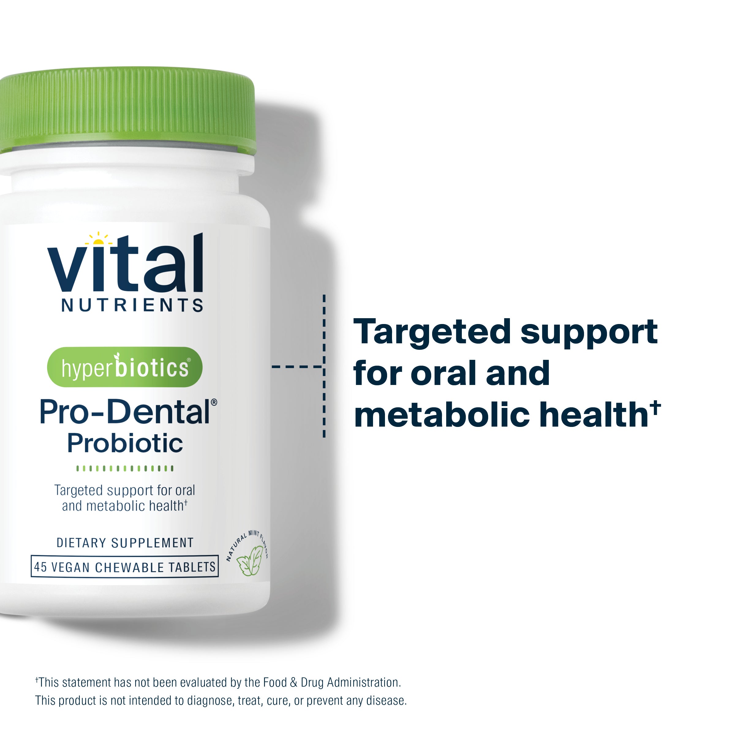 BLIS® probiotics for optimal oral health: Certain strains of Streptococcus salivarius, known as BLIS strains, have been clinically studied for crowding out the harmful bacteria that cause tooth decay and bad breath and releasing a specialized enzyme that targets those same bacteria and inhibits their growth.2 Pro-Dental Probiotic is the first dental probiotic to deliver-dairy free BLIS strains. This delicious mint chewable tablet helps replenish a balance of good bacteria in the oral microbiome.*
