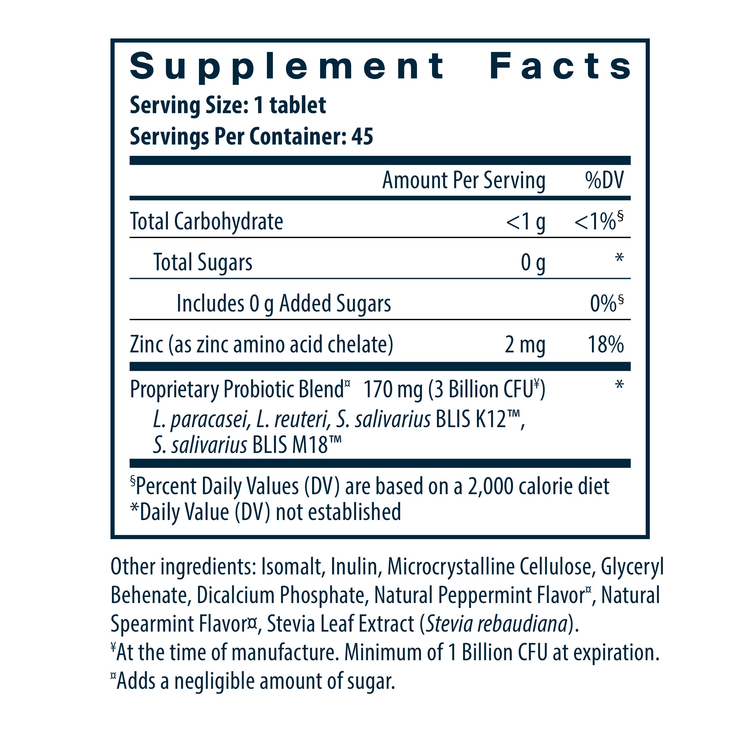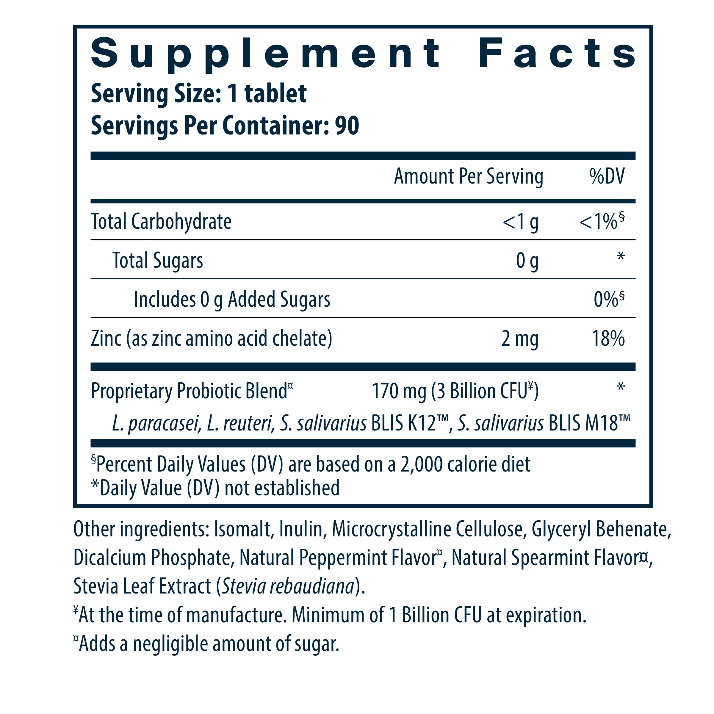 | Propietary Probiotic Blend (L. paracasei, L. reuteri, S. salivarius BLIS K12™, S salivarius BLIS M18™ | 170 mg (3 Billion CFU) | * |