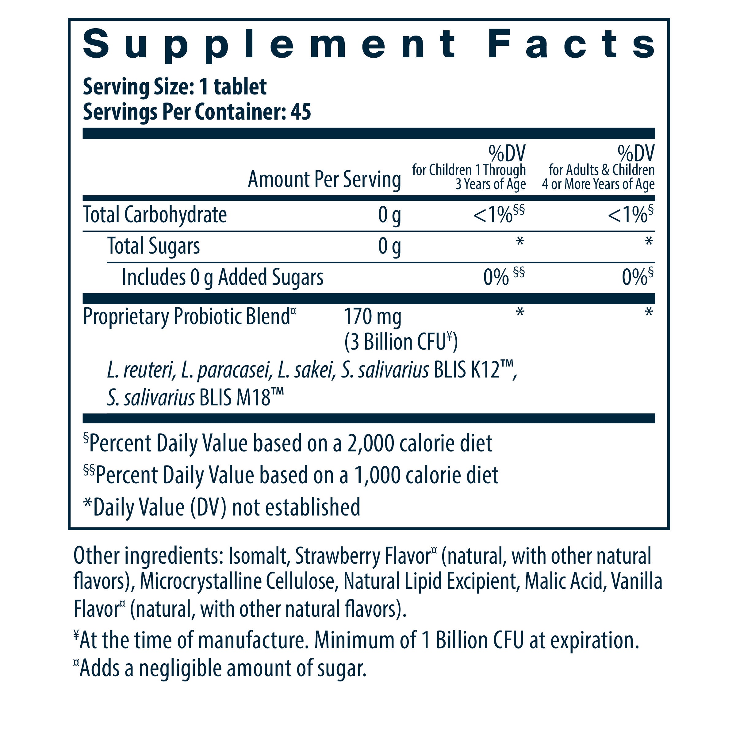 Probiotic strain type: Lactobacillus reuteri, Lactobacillus paracasei, Lactobacillus sakei, Streptococcus salivarius BLIS K12™, Streptococcus salivarius BLIS M18™, providing a powerful probiotic mix clinically studied to reduce incidence of seasonal infections and reducing the number of re-occurring infections.