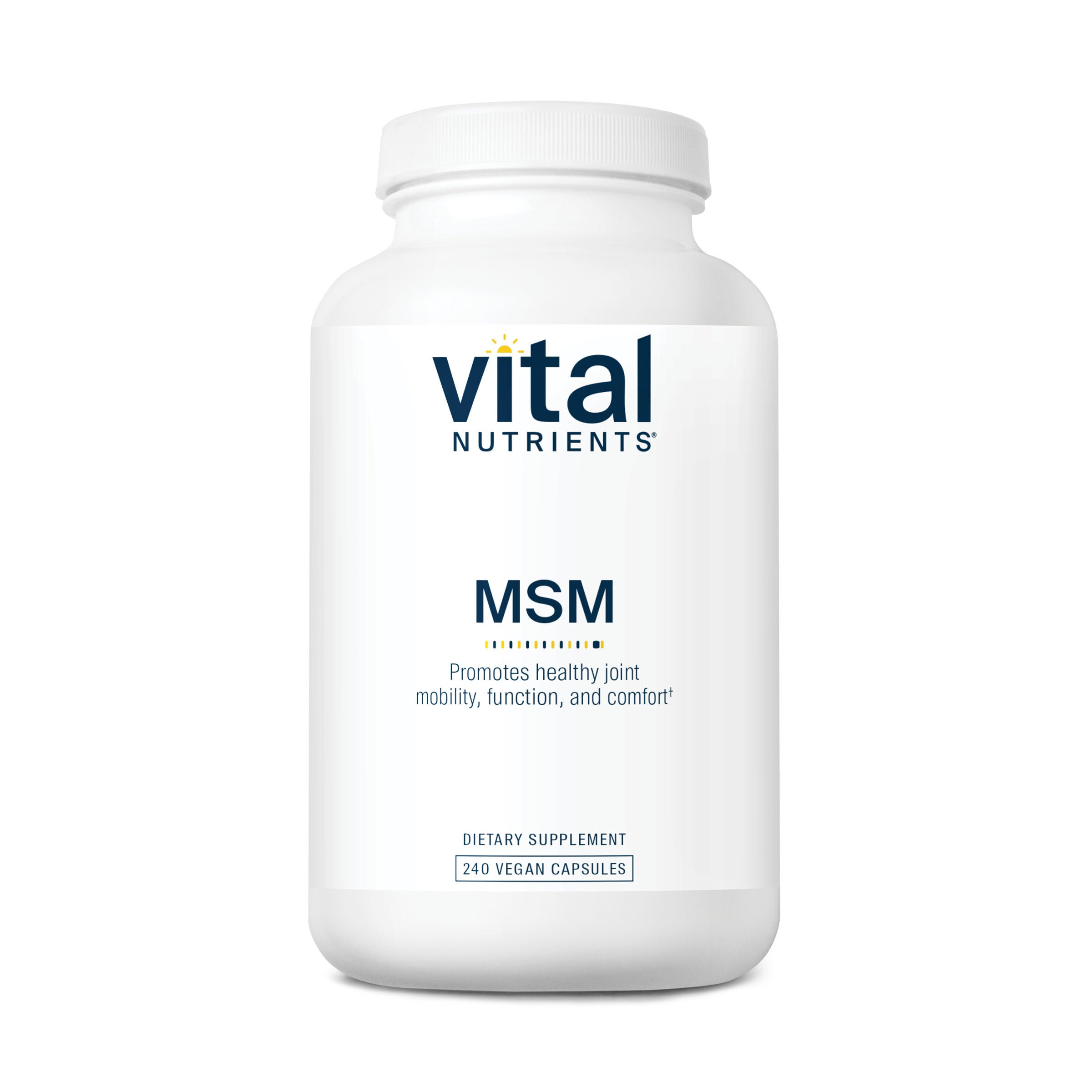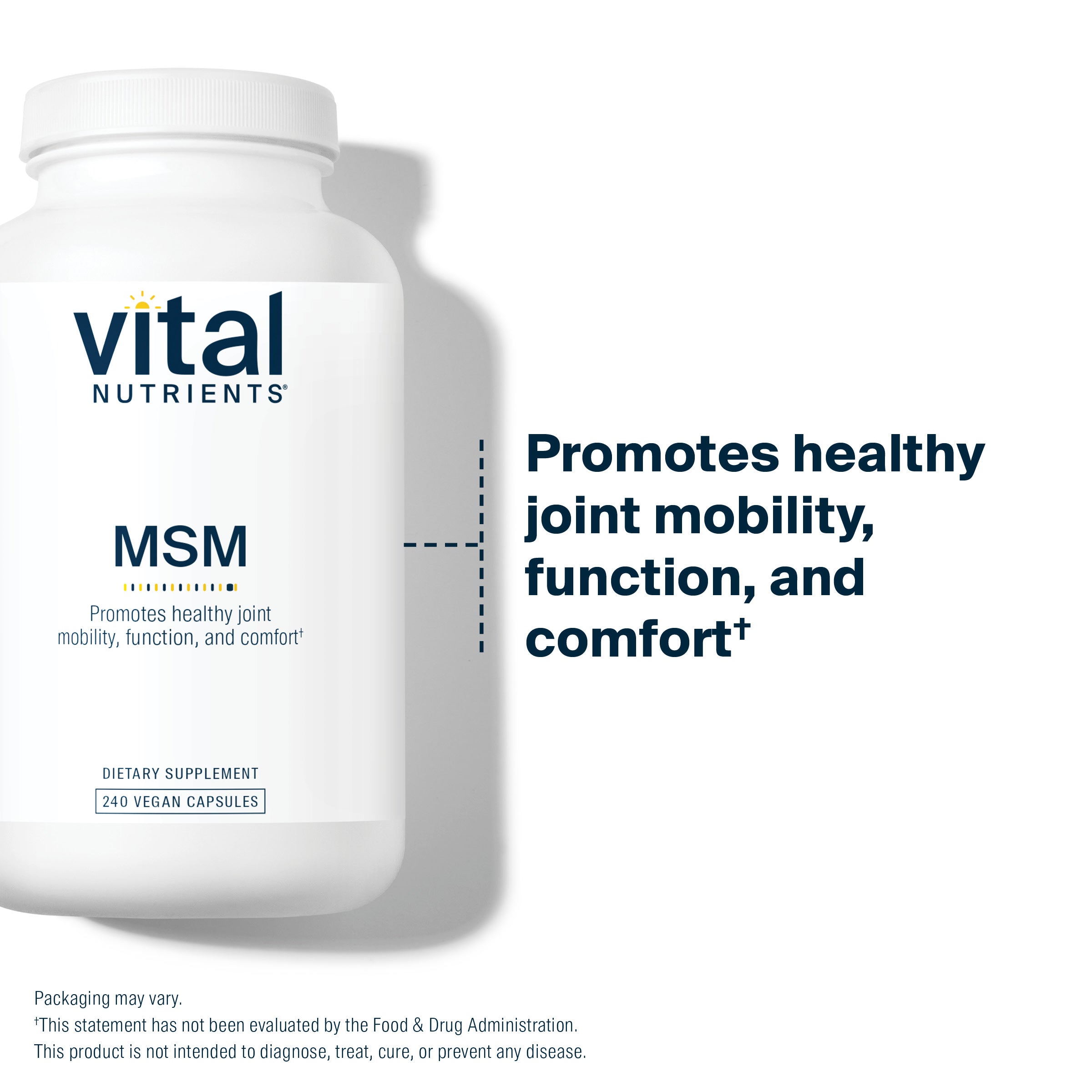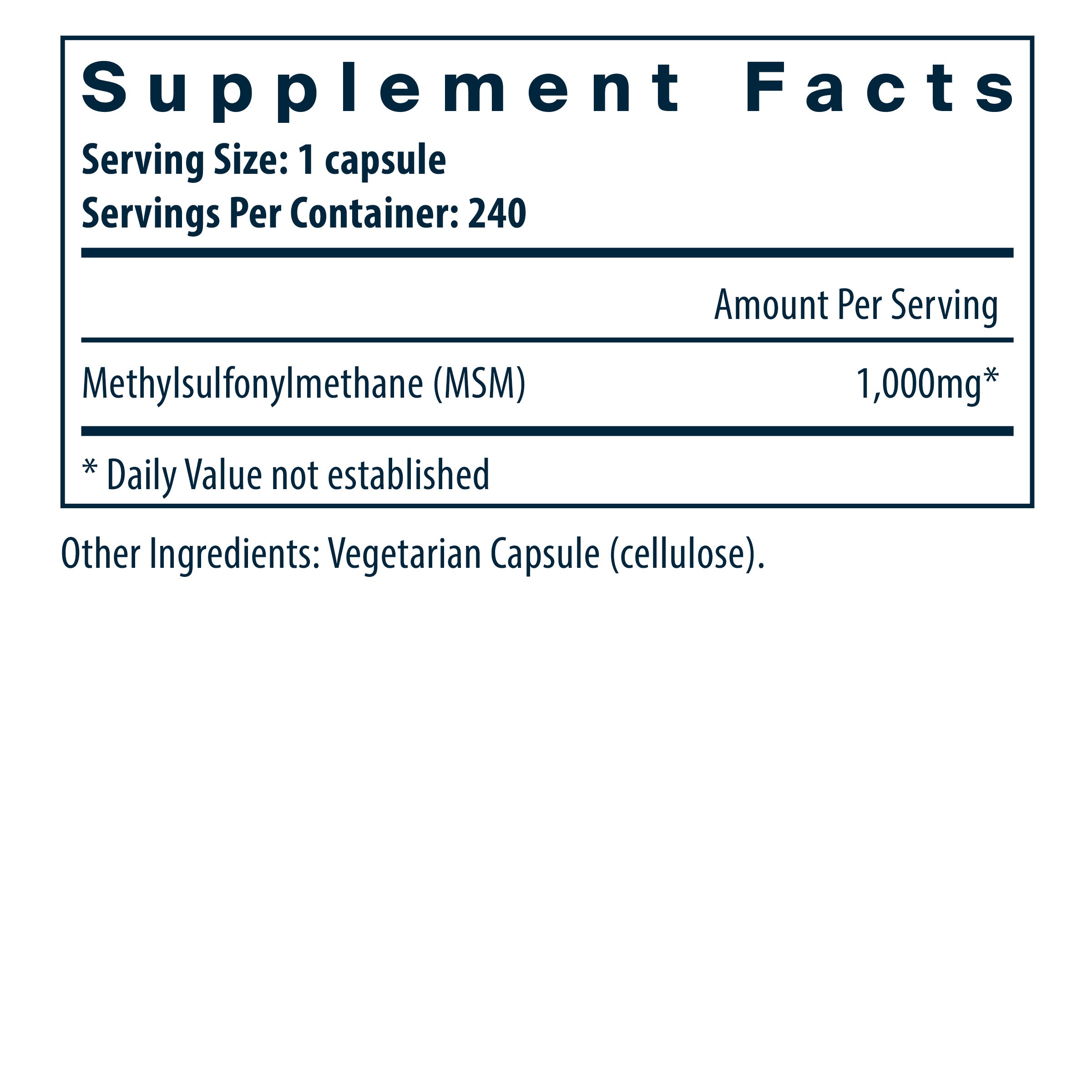 MSM 1000mg provides methylsulfonylmethane, an odorless form of organic sulfur that is naturally occurring in small amounts in fruits, vegetables, grains, and animals. In vitro studies have suggested that MSM may act as an antioxidant.* MSM supports normal tissue function.* MSM supplements may also promote joint health by supporting healthy mobility and function, as well as by maintaining normal joint comfort.* MSM 1000mg may also help promote stable cell membranes, inflammatory balance and colon health.*