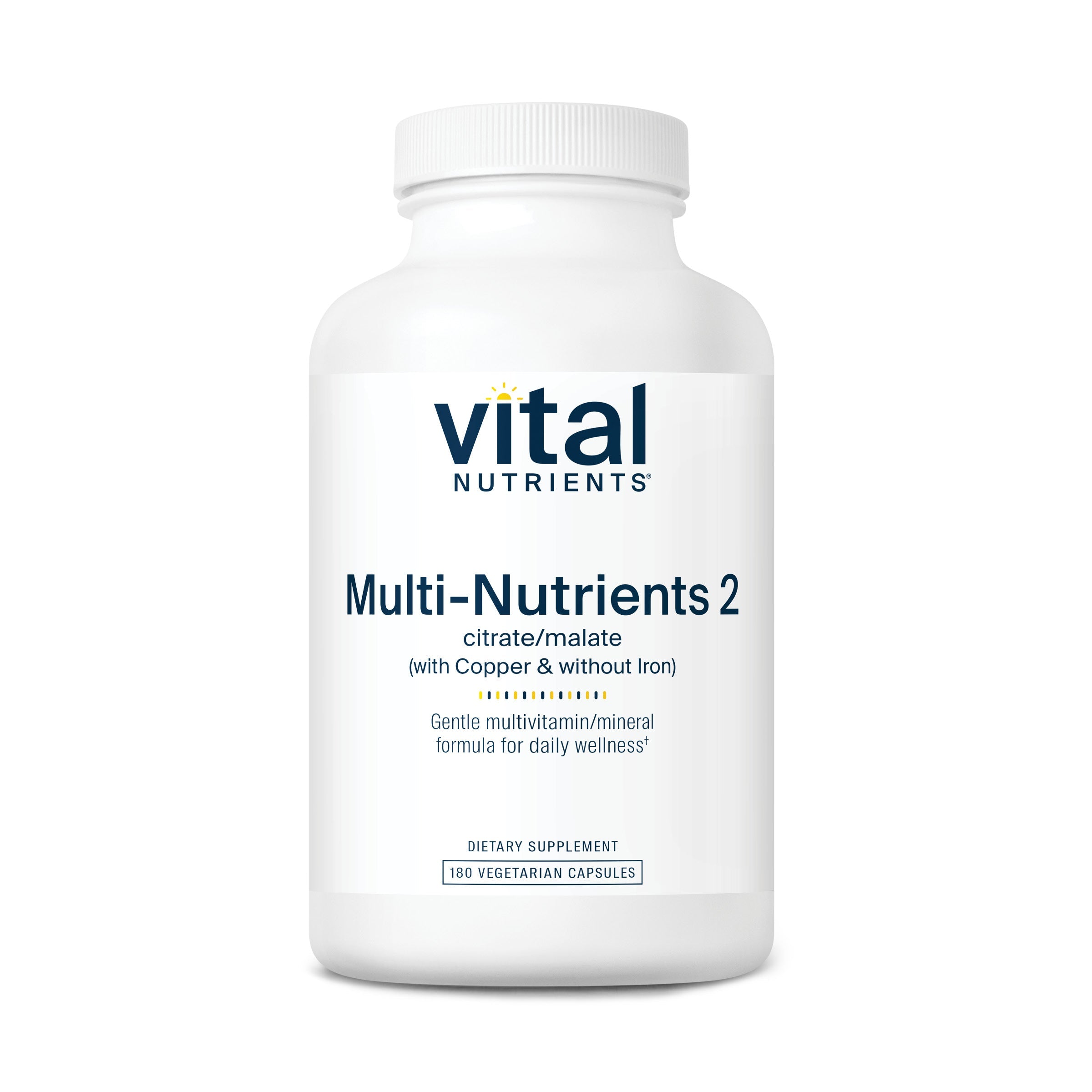 Multi-Nutrients 2 is a high potency multi-vitamin/mineral and trace element formula that provides the highest nutritional value for all systems of the body, including bone, skin, cardiovascular, liver, and immune support.* This formula incorporates premium ingredients to ensure optimal absorption and physiological activity, including folate as Metafolin® L-5-MTHF, Vitamin D3, potent antioxidants and mineral amino acid chelates.* It is a bioavailable, gentle formula that is well tolerated by most individuals.* Multi-Nutrients 2 contains minerals in citrate/malate form for better absorption.* This formula contains copper and does not contain iron.*