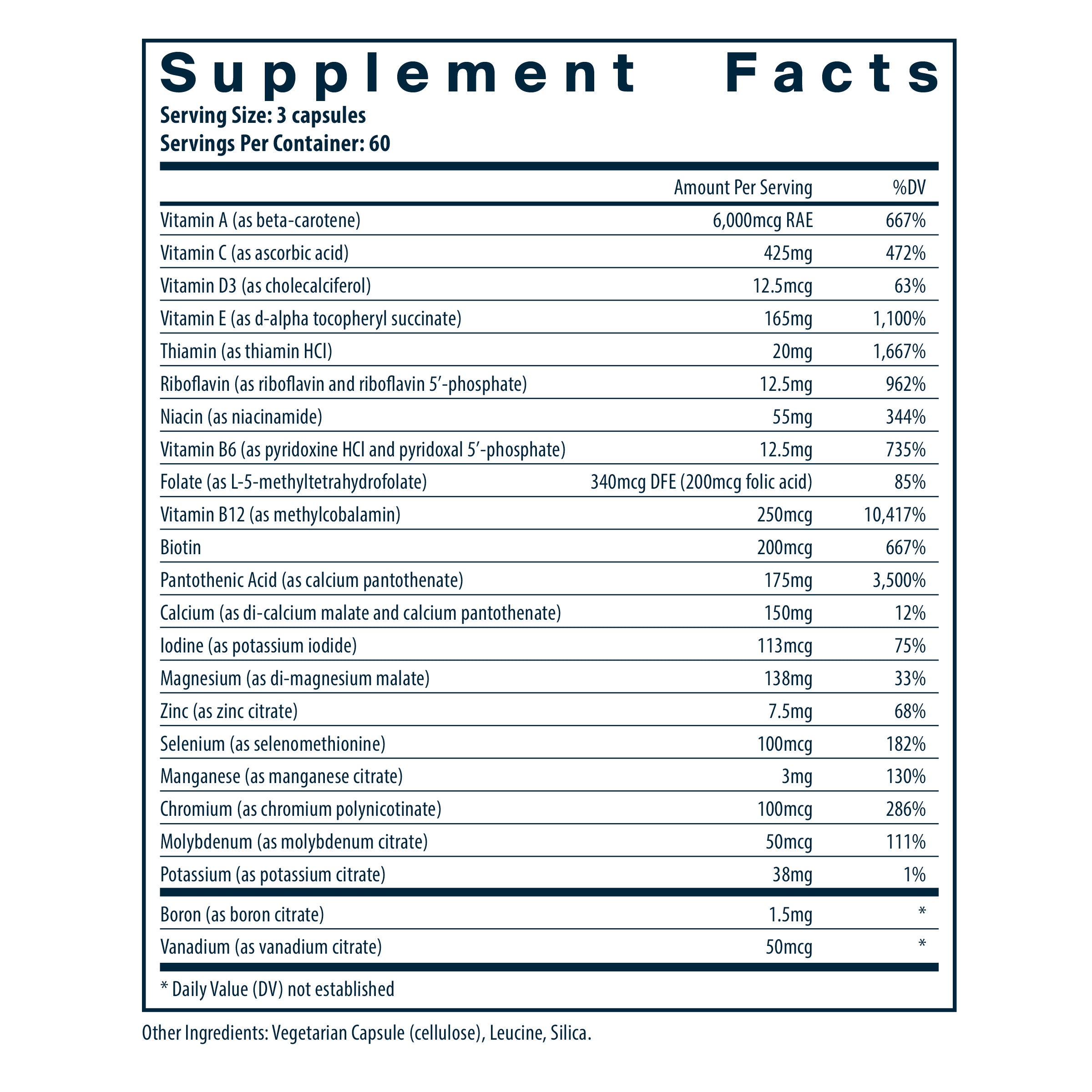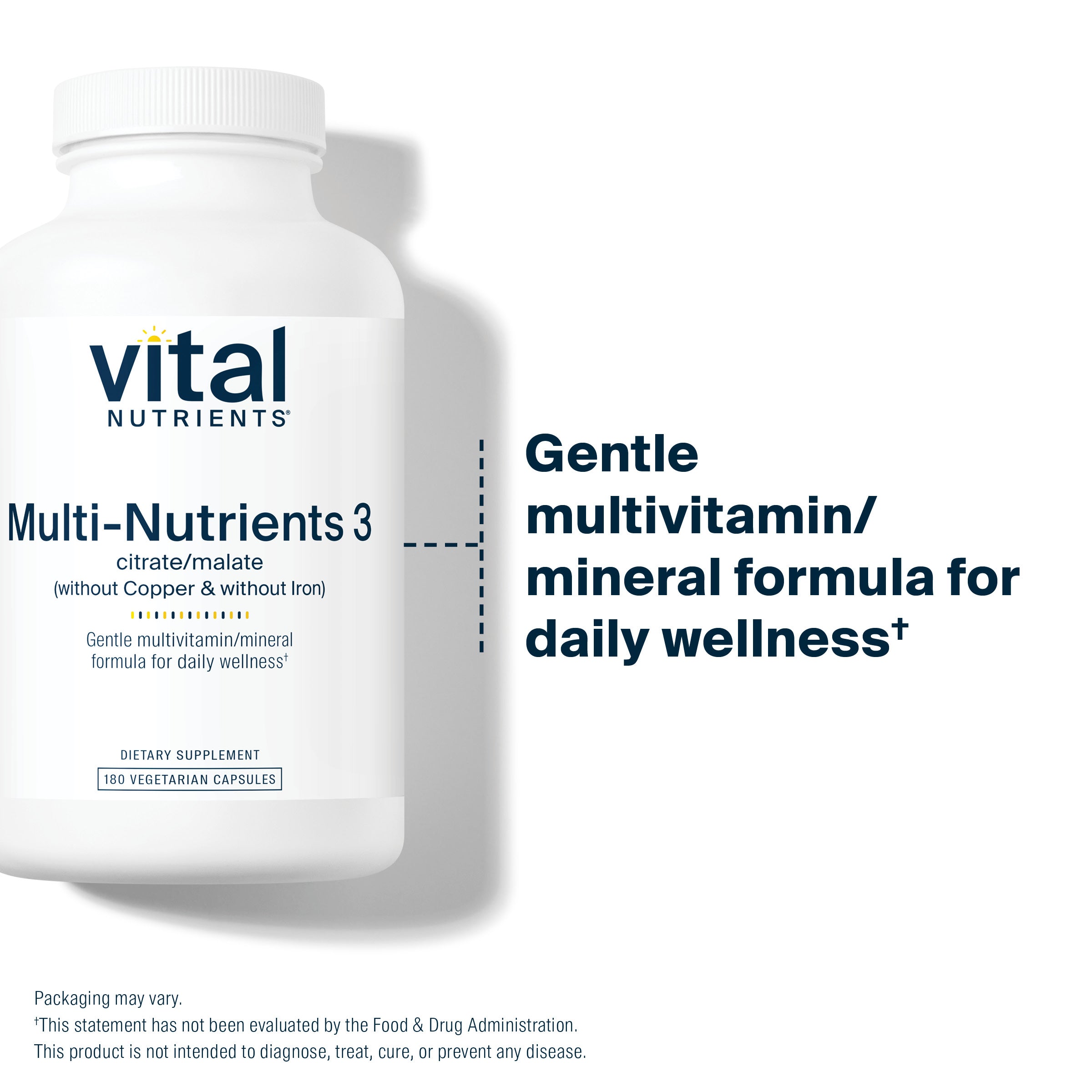 Multi-Nutrients 3 is a high potency multi-vitamin/mineral and trace element formula that provides the highest nutritional value for all systems of the body, including bone, skin, cardiovascular, liver, and immune support.* This formula incorporates premium ingredients to ensure optimal absorption and physiological activity, including folate as Metafolin® L-5-MTHF, Vitamin D3, potent antioxidants and mineral amino acid chelates.* It is a bioavailable, gentle formula that is well tolerated by most individuals.* Multi-Nutrients 3 contains minerals in citrate/malate form for better absorption.* This formula does not contain copper or iron.*