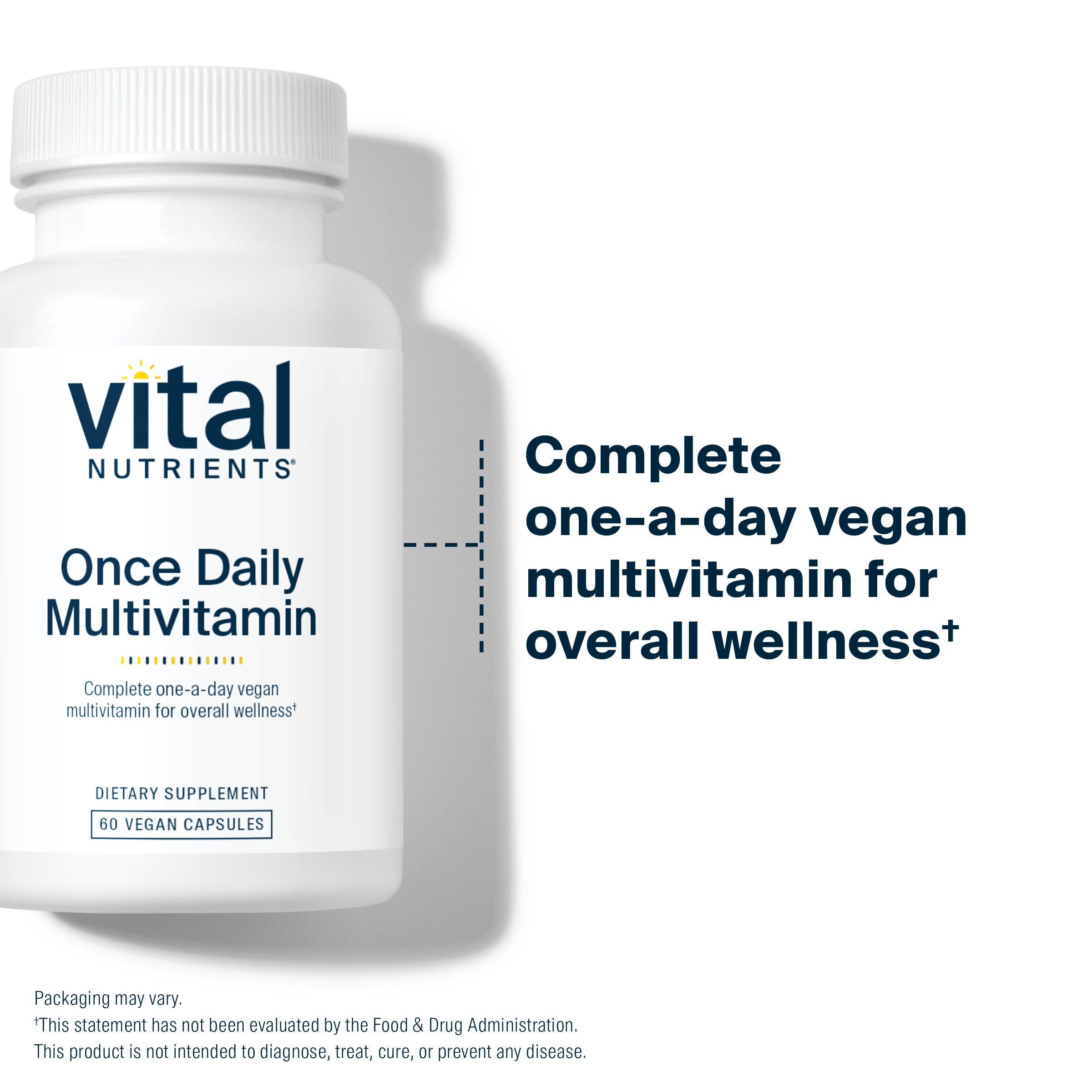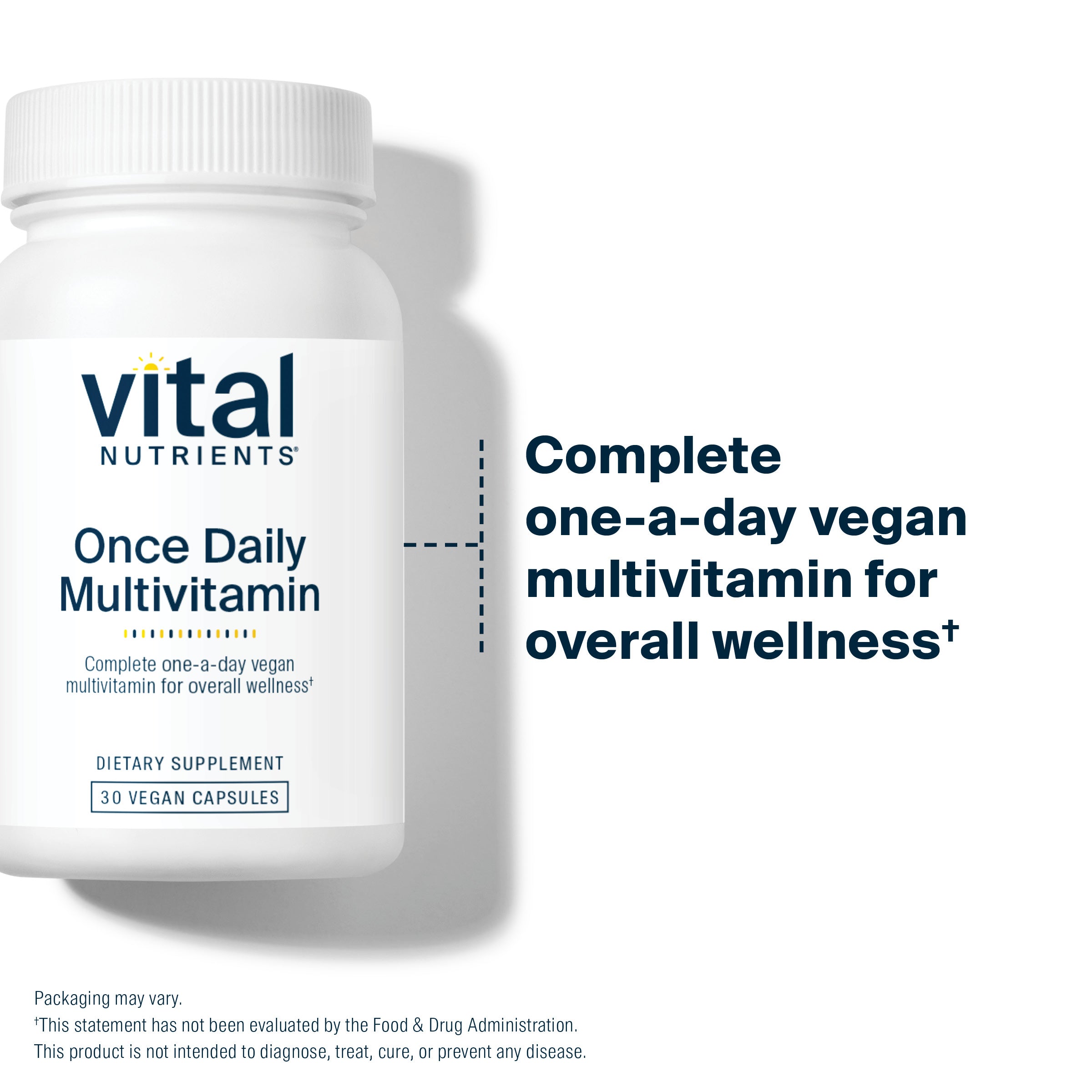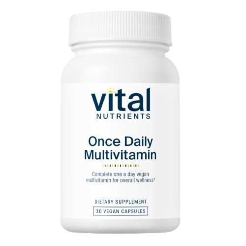 Vital Nutrients Once Daily Multivitamin is a clean and easy-to-take, one-per-day multivitamin specifically formulated to provide essential nutrients needed for a healthy lifestyle and help fill the nutrient gaps in the daily diet. Once Daily is a completely vegan formula, even including vegan vitamin D.