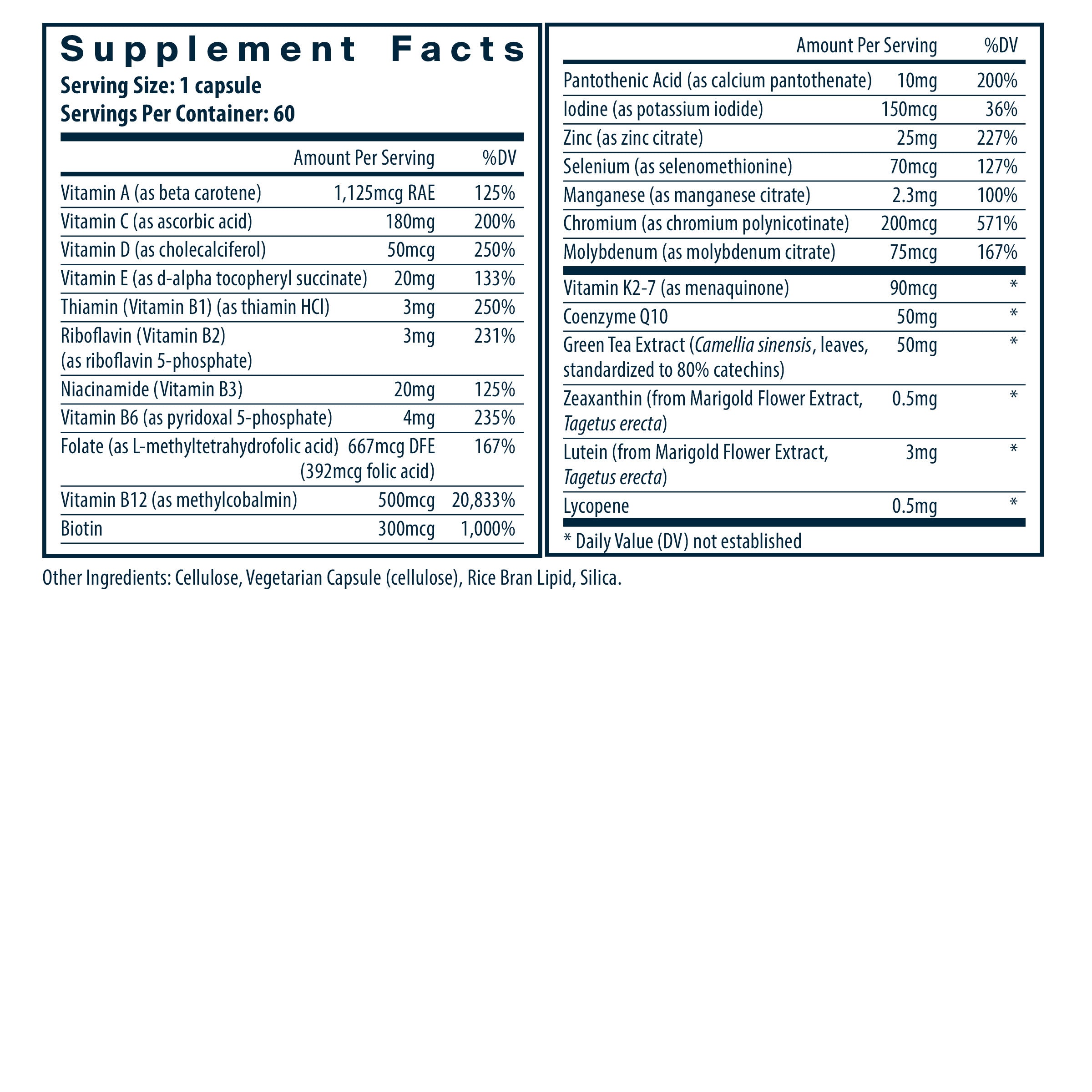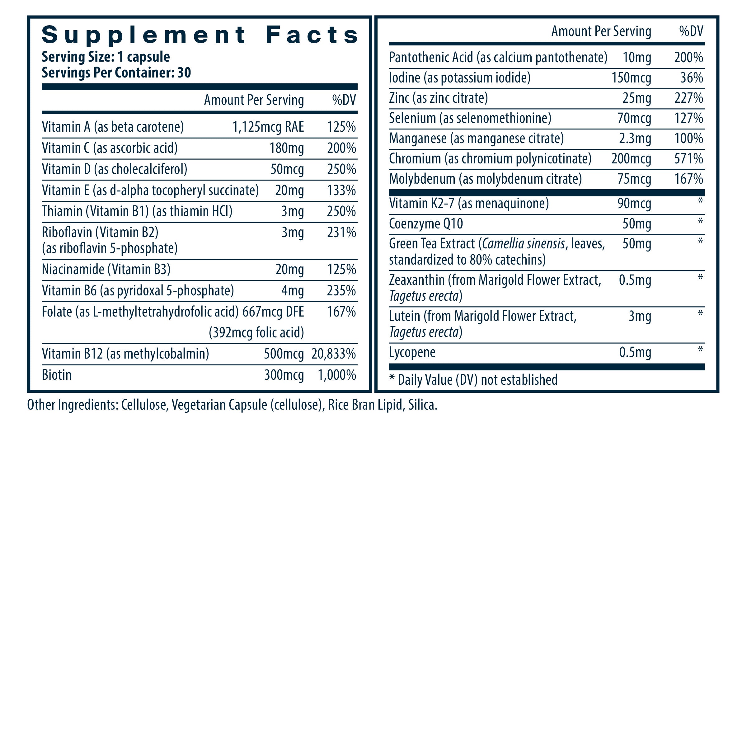 This single-capsule serving is designed for overall wellness and contains 19 vitamins and minerals as well as additional nutrients for cellular energy, eye health, and antioxidant support for heart health.2-5*