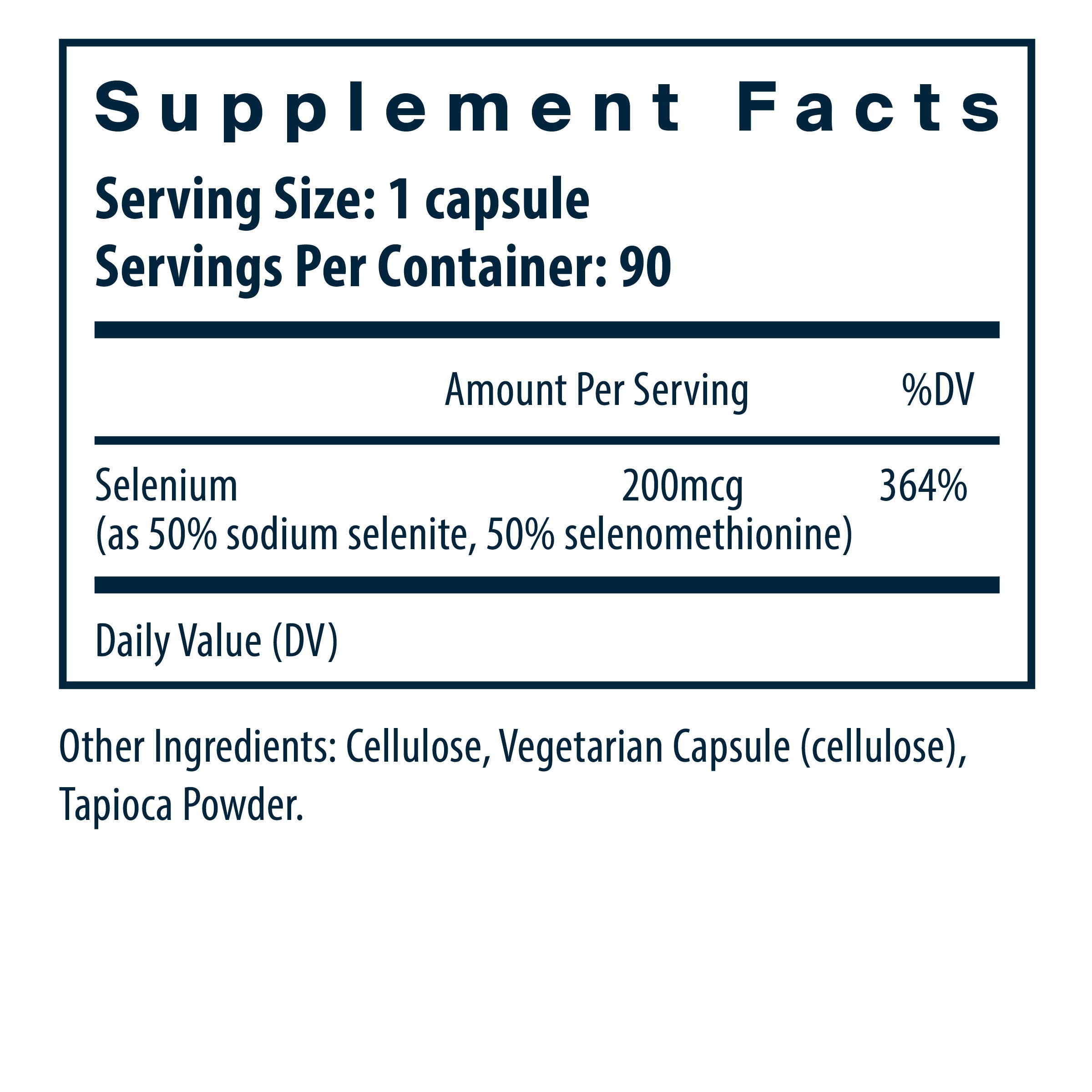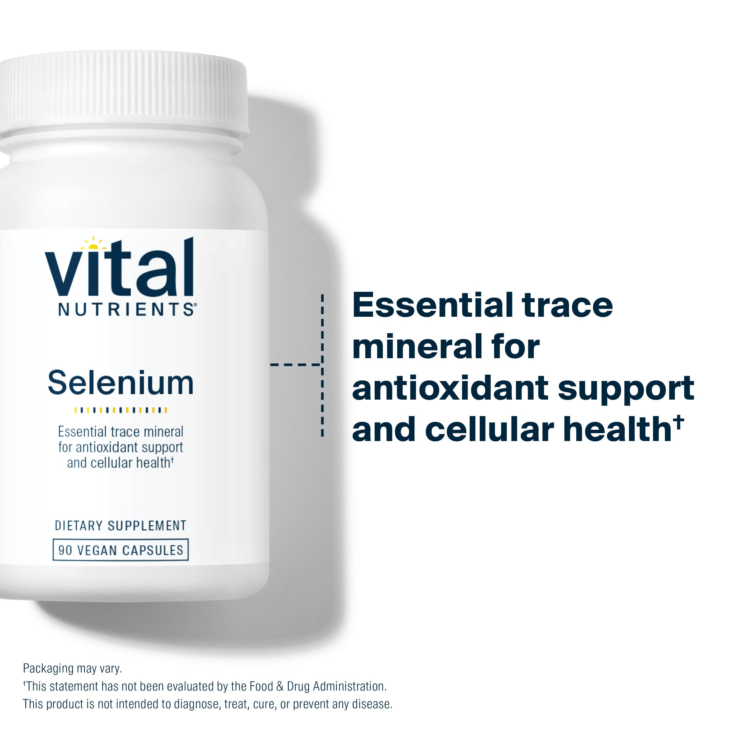 Selenium is a trace element and potent antioxidant that is essential to the body in small amounts.* Selenium helps cells to function normally by supporting the action of several enzymes, particularly antioxidant enzymes and those involved in thyroid hormone metabolism.* Selenium also supports the cardiovascular and immune systems, and may help maintain prostate health .* Vital Nutrients Selenium 200mcg includes selenomethionine, a high-bioavailability, organic source of this essential trace mineral.*