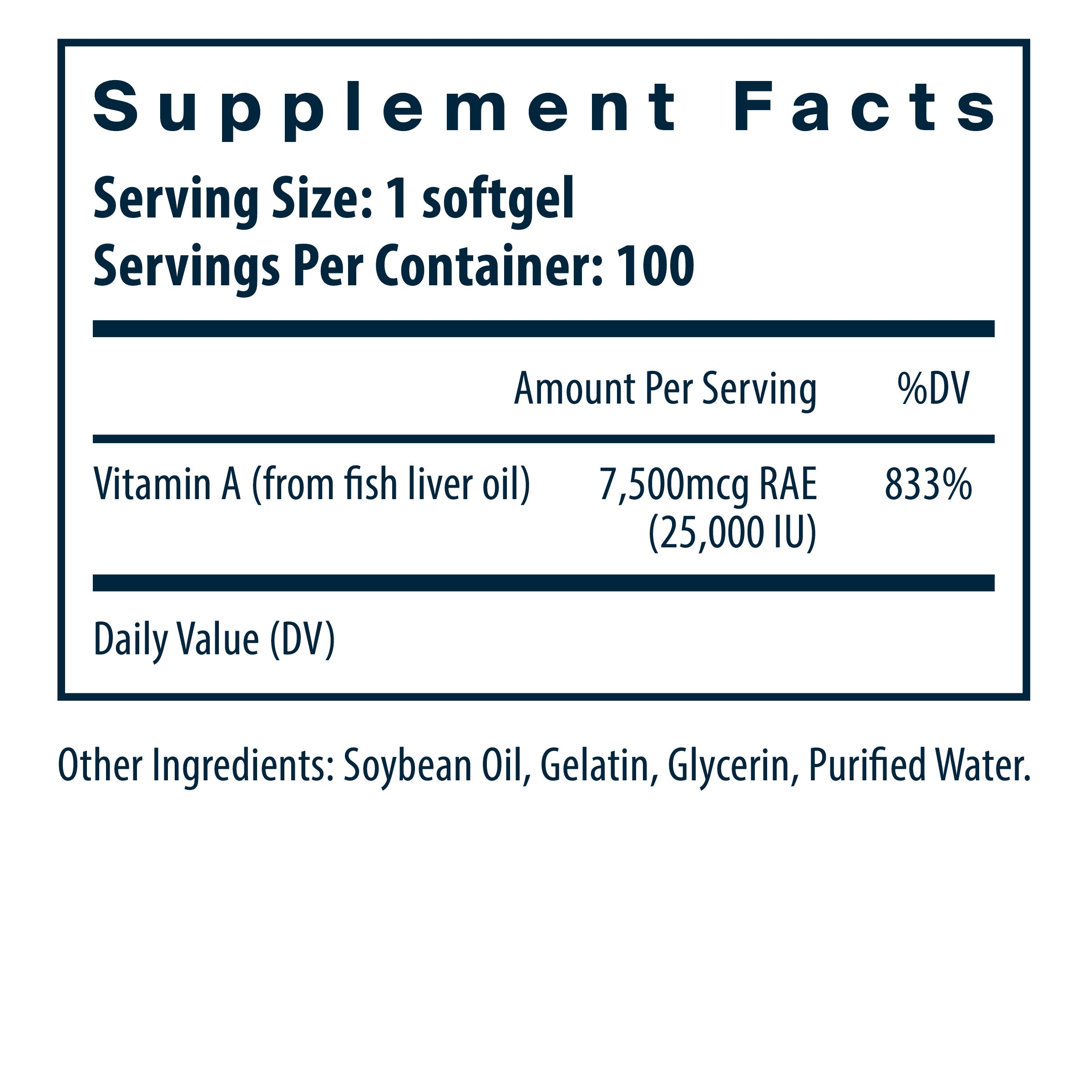 Vitamin A (from Fish Liver Oil) is a fat-soluble vitamin that is helpful to support the proper functioning of the body's immune system.* It supports normal cell growth and the maintenance of skin, mucus membranes, eye health, vision and reproductive functions.* Its antioxidant properties help protect the body from oxidative damage and support healthy night vision.* (High doses of Vitamin A should be used with physician supervision).