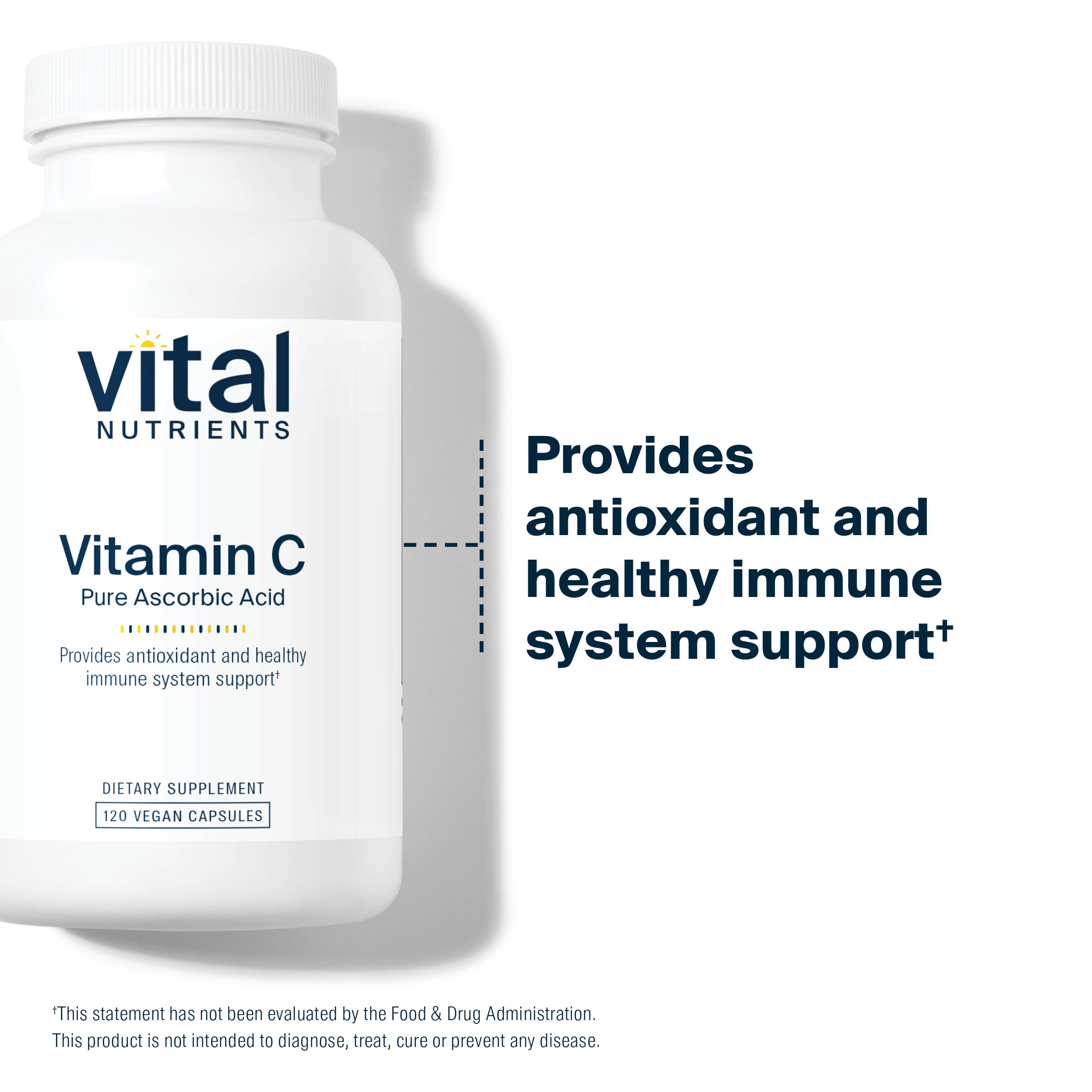 Vitamin C (100% pure ascorbic acid) helps the body’s immune system by supporting antibody responses, white blood cell function and activity, and helps maintain normal interferon levels.* It is one of the most potent dietary antioxidants and provides nutritional support to all functions of the body.* Vitamin C supports iron absorption from the gastrointestinal tract and is an important component of collagen synthesis.* Vitamin C assists in tissue formation.*It comes in easy-to-digest vegetarian capsules.*