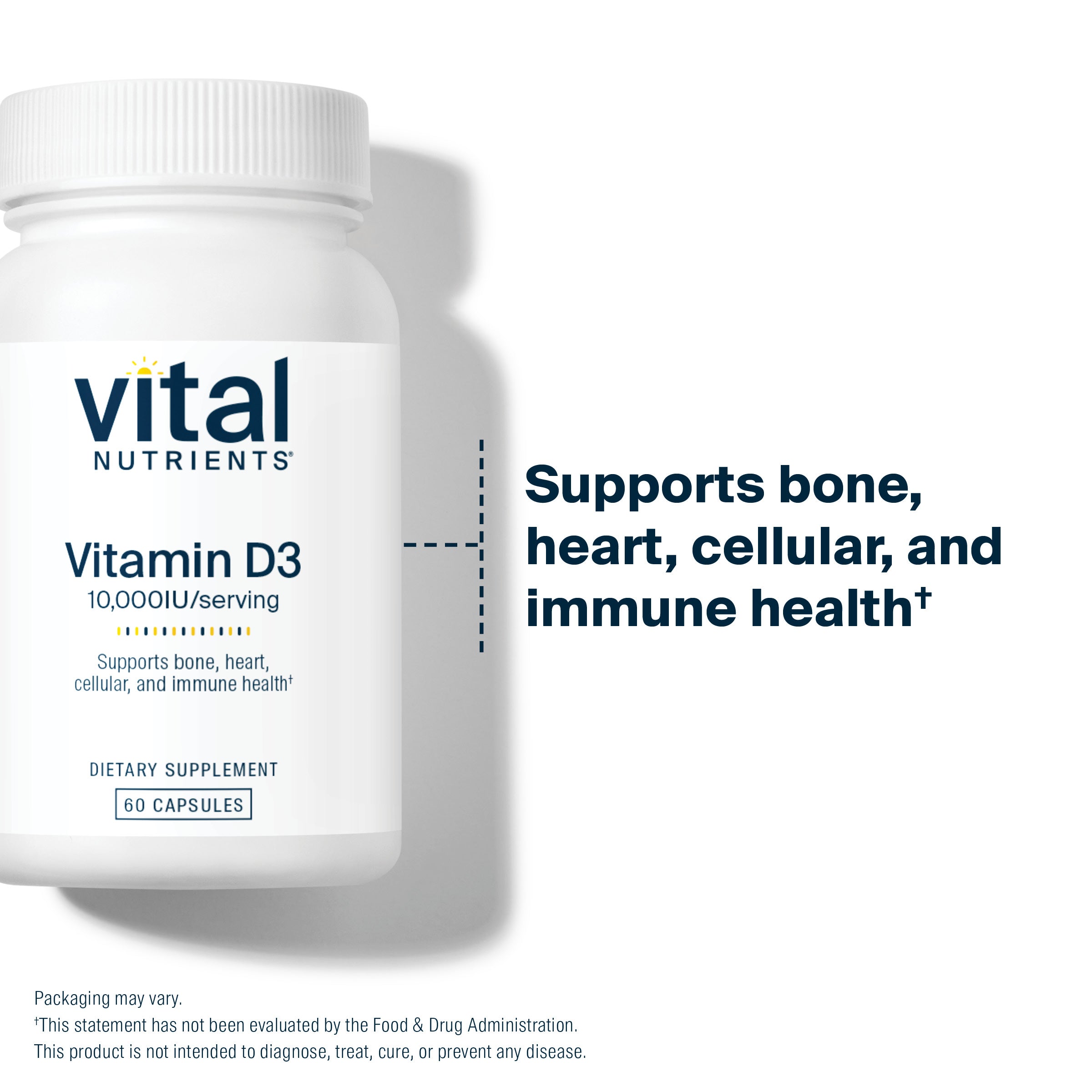 Vitamin D3 is a fat-soluble vitamin that helps maintain strong bones and teeth by supporting healthy serum calcium levels.* It does this by promoting absorption of calcium in the digestive tract, as well as reducing calcium loss through urine.* Additionally, Vitamin D supports colon health, and may promote a healthy immune system.* Vitamin D occurs naturally in very few foods, and although it can be produced in the body, obtaining adequate skin absorption from sun exposure can be difficult year round.* Vital Nutrients offers supplemental Vitamin D in the active form D3 (also known as cholecalciferol).*